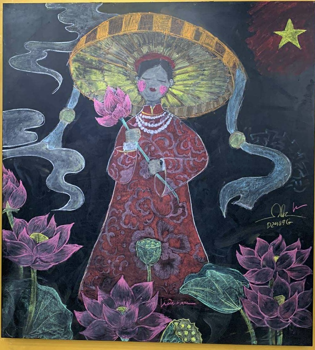 Người phụ nữ Việt dịu dàng trong tà áo dài đỏ, tay nâng đóa sen hồng giữa sắc cờ Tổ quốc – biểu tượng cho vẻ đẹp thanh khiết, kiên cường và tự hào dân tộc.