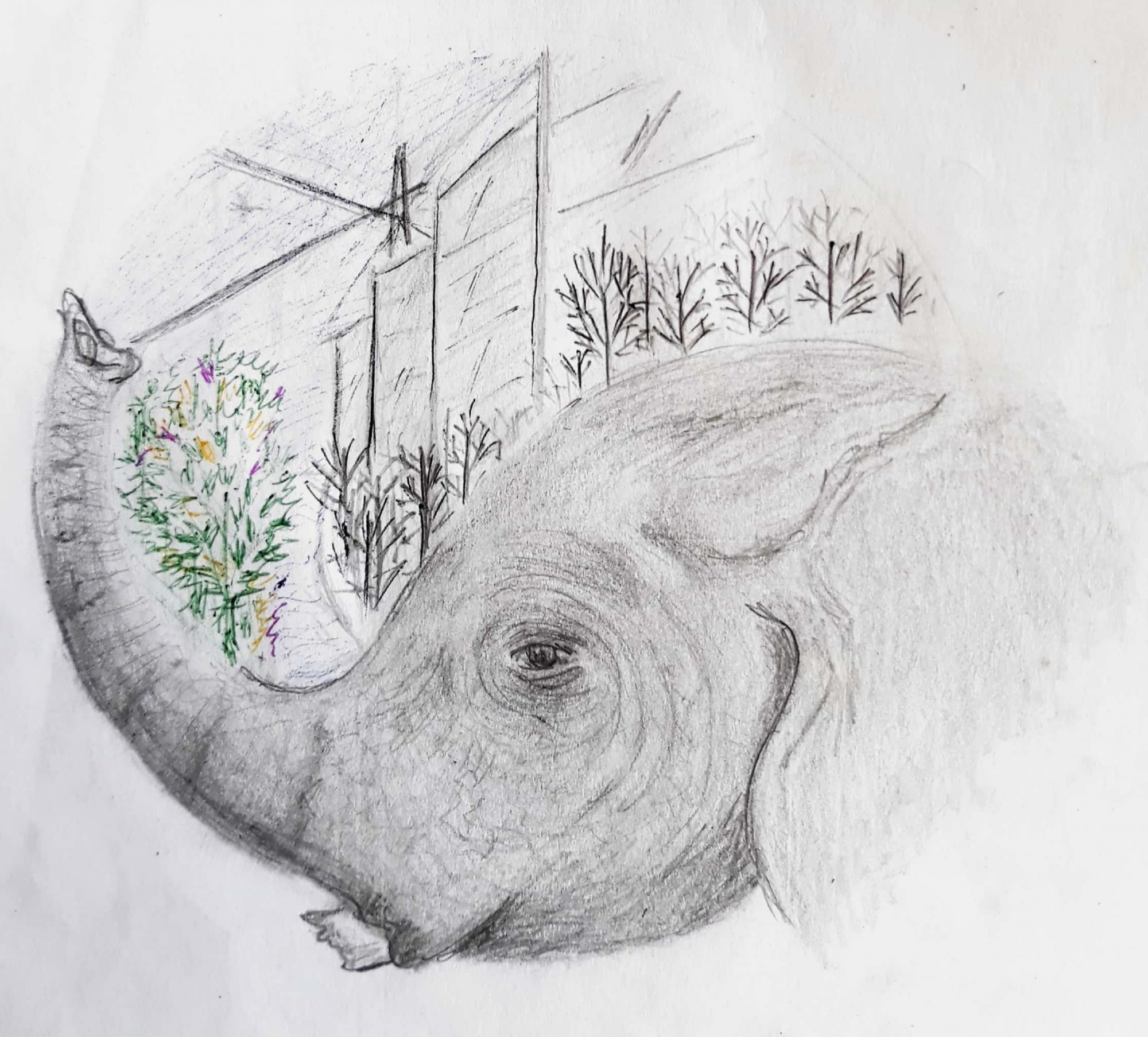 Hình vẽ là một chú voi đã bị mất một phần ngà bởi sự săn bắt trái phép. Bên trái phía sau là rừng với nhiều cây cỏ xanh tươi, các động vật sinh sống. Còn bên phải là những tác động của con người lên môi trường sống của động vật hoang dã: chặt cây lấy gỗ, xây nhà ở, chung cư, khu công nghiệp.