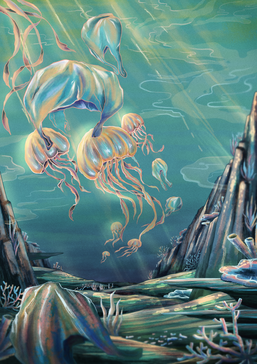 Đây là tác phẩm được lấy ý tưởng từ một công viên nước, nơi nuôi và trưng bày các loại động vật dưới nước. Khi mình bắt gặp một hồ cá mà trong đó chỉ có những bọc nhựa trôi nổi trong nước, điều đó đã gây ấn tượng mạnh với mình về những tác động xấu của con người lên môi trường, cụ thể hơn ở đây là môi trường biển. Đó cũng là ý tưởng để mình thực hiện tác phẩm lần này. Nội dung của bức tranh có vẻ tiêu cực nhưng mình đã chọn một gam màu tươi sáng, nổi bật để có thể mang lại một cảm giác không quá u sầu tăm tối, một màu sắc có thể khiến chúng ta có nhận thức tốt hơn về môi trường biển. Mong muốn của bản thân mình là được nhìn thấy một không gian biển sạch sẽ, không có rác thải. Thông điệp chính của mình mang đến cuộc thi thông qua bức tranh là việc mọi người phải nhận thức được việc bảo vệ môi trường nói chung và môi trường biển nói riêng