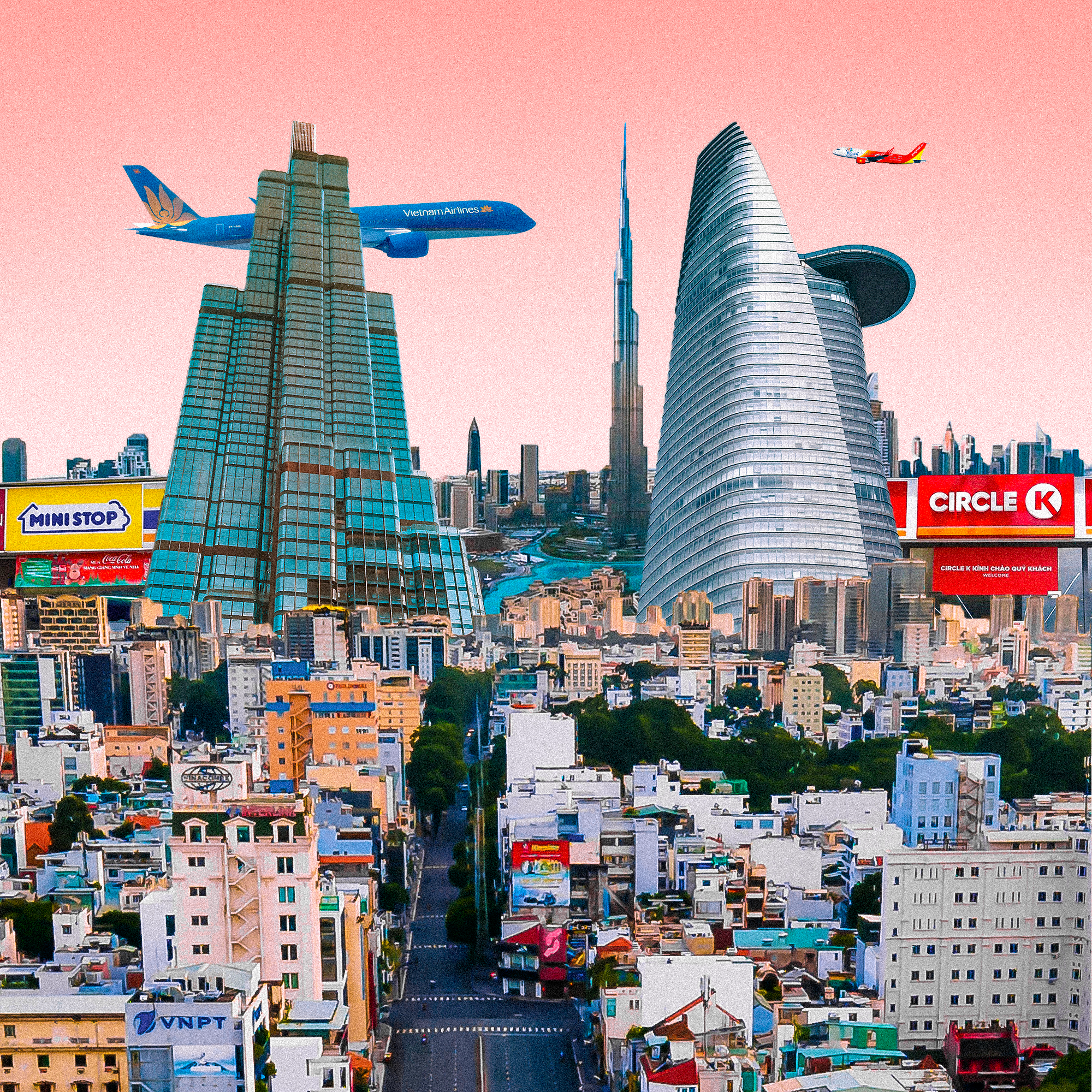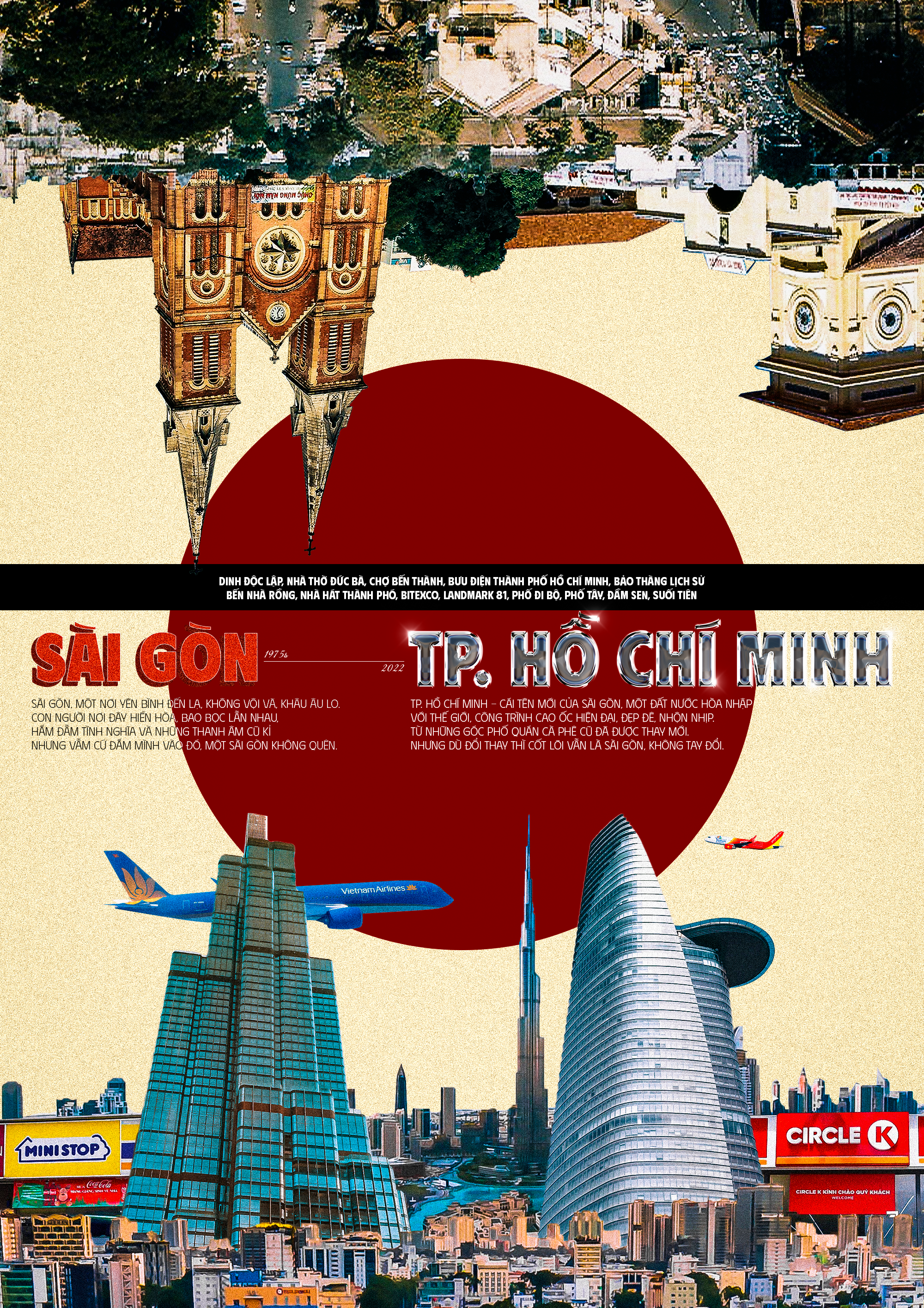 Thành Phố Hồ Chí Minh (2022) Thành Phố Hồ Chí Minh – một tên gọi mới của Sài Gòn, bắt đầu một thế hệ mới, phát triển vượt bậc, một thành phố hòa nhập với thế giới. Và như trong bức ảnh ta cũng có thể thấy, những tòa cao ốc mọc lên rất nhiều, số lượng chung cư tăng vượt bậc và nhà dân cũng cao lên. Những cửa hàng tiện lợi dần dần thay thế các tiệm tạp hóa ngày xưa, giá thành cạnh tranh. Có máy bay của Việt Nam có thể đi du lịch trong nước hay ngoài nước trong 1 thời gian ngắn. Thành phố đã bắt đầu hiện đại hóa nhanh chóng và giờ khi nhắc đến thành phố Hồ Chí Minh thì khách du lịch sẽ nhớ ngay là “Landmark 81” hay “Bitexco”, mặc dù “nhà thờ Đức Bà” hay “chợ Bến Thành” vẫn còn đó nhưng theo thời gian thì 2 địa điểm đó không còn được để mắt như trước. Và em cũng để 2 ảnh của “Landmark 81” và “Bitexco” to để cho thấy sự nổi bật của 2 địa điểm này đối với thành phố. Nên thành phố Hồ Chí Minh giờ đây không thua kém các nước trên thế giới. Bầu trời em đi gradient màu hồng pastel cho thấy được sự hiện đại nhưng kèm theo đó vẫn có một chút ấm áp của người dân thành phố Hồ Chí Minh nói riêng hay VIệt Nam nói chung.