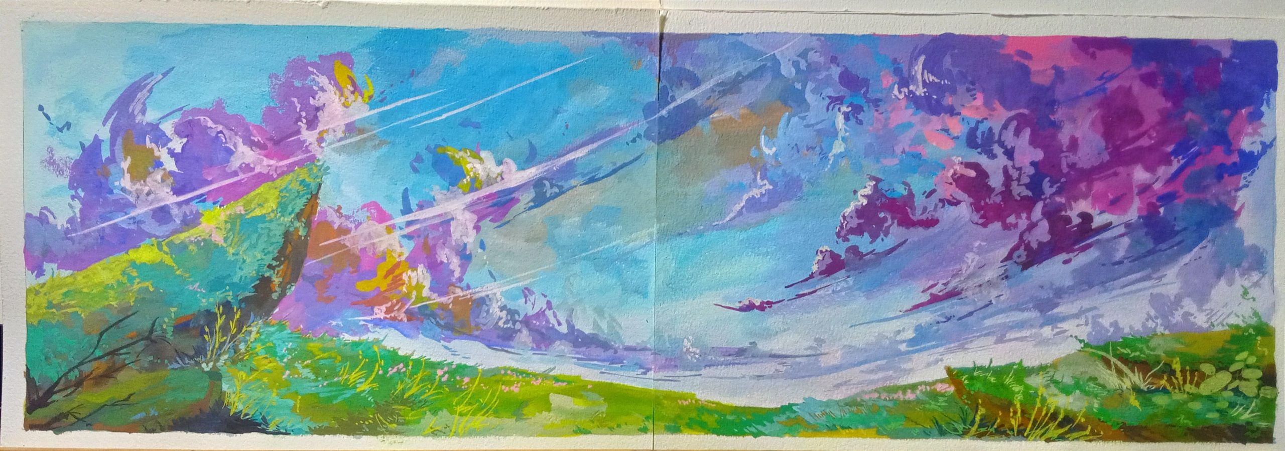 Đứa con tinh thần của em mang tên là “Bầu trời xanh”, bởi vì nó làm em nhớ đến đã từng có quãng thời gian cả thành phố Hồ Chí Minh bị bao trùm trong làn sương trắng đục. Trong làn sương ấy là chất ô nhiễm như bụi, NO2, SO2,CO,… Nó không chỉ ảnh hưởng đến tình trạng sống, sinh hoạt người dân, đặt biệt là điều kiện hô hấp của trẻ nhỏ và người già mà cả môi trường xung quanh nữa. Em vẽ bức tranh này như thể hiện khao khát một bầu trời trong xanh, tươi đẹp , sạch sẽ và không khí không bị ô nhiễm.
