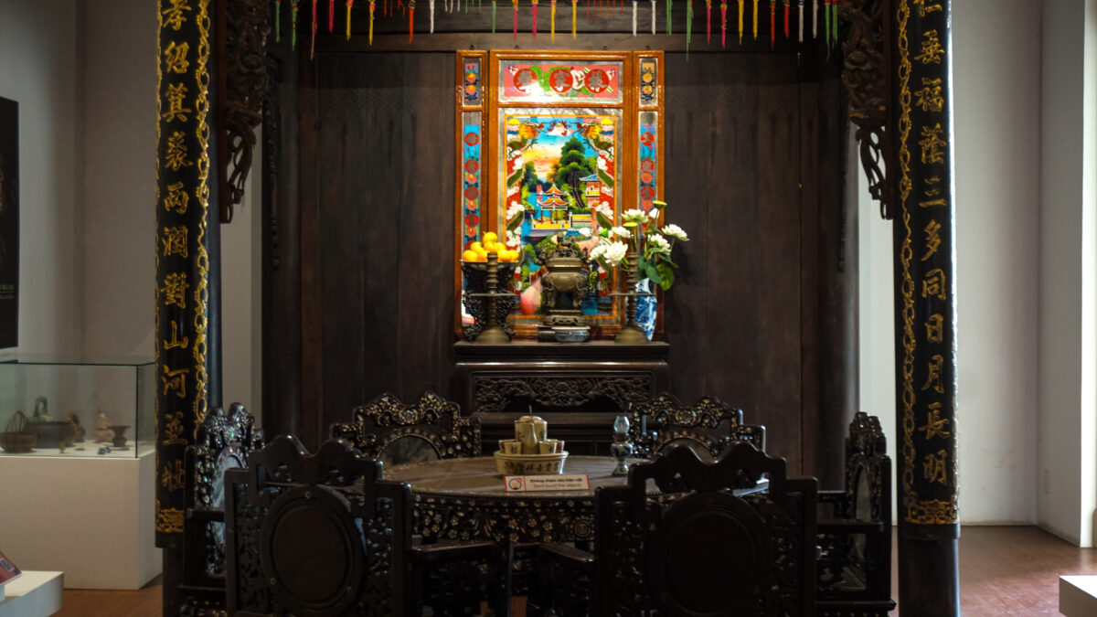 Tác phẩm 1: Tái hiện không gian thờ cúng và sinh hoạt truyền thống của gia đình quyền quý Sài Gòn xưa, với bộ bàn ghế gỗ chạm khắc tinh xảo và bàn thờ trang nghiêm.