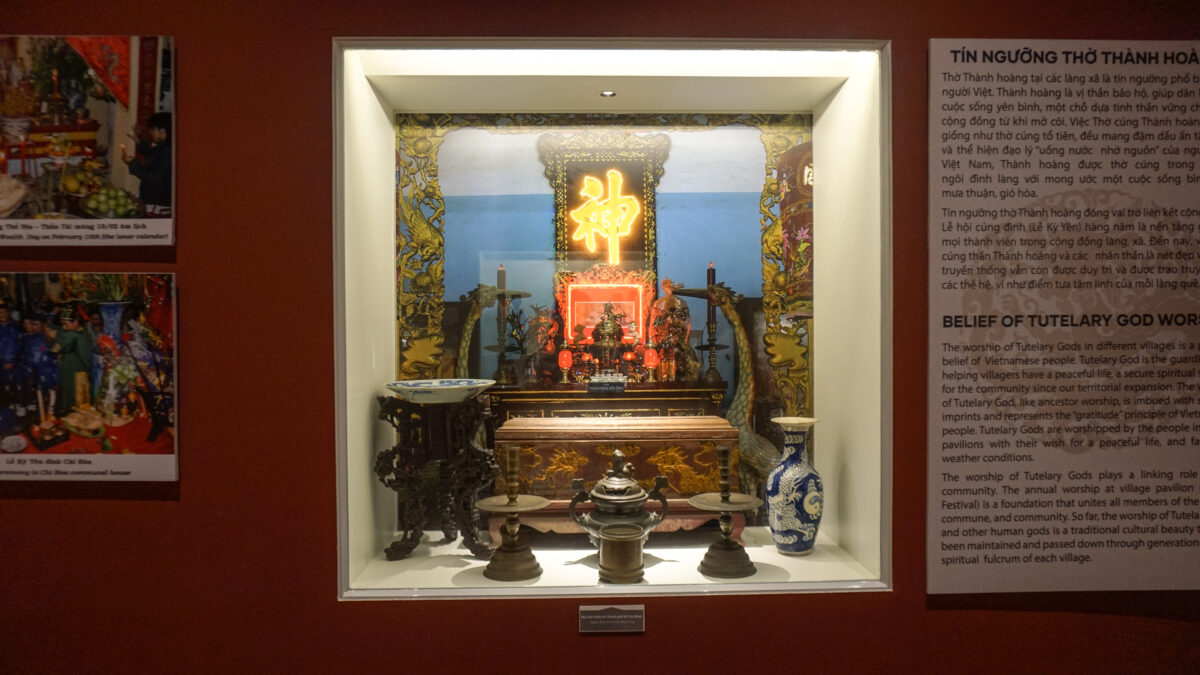 Tác phẩm 2: Tủ trưng bày mô hình bàn thờ Thần Thành Hoàng/Thổ Công, với bài vị chữ Hán lớn (Thần), đồ thờ cúng và các hiện vật gốm sứ liên quan, kèm bảng chú thích về “Tín ngưỡng Thờ Thần Thành Hoàng”