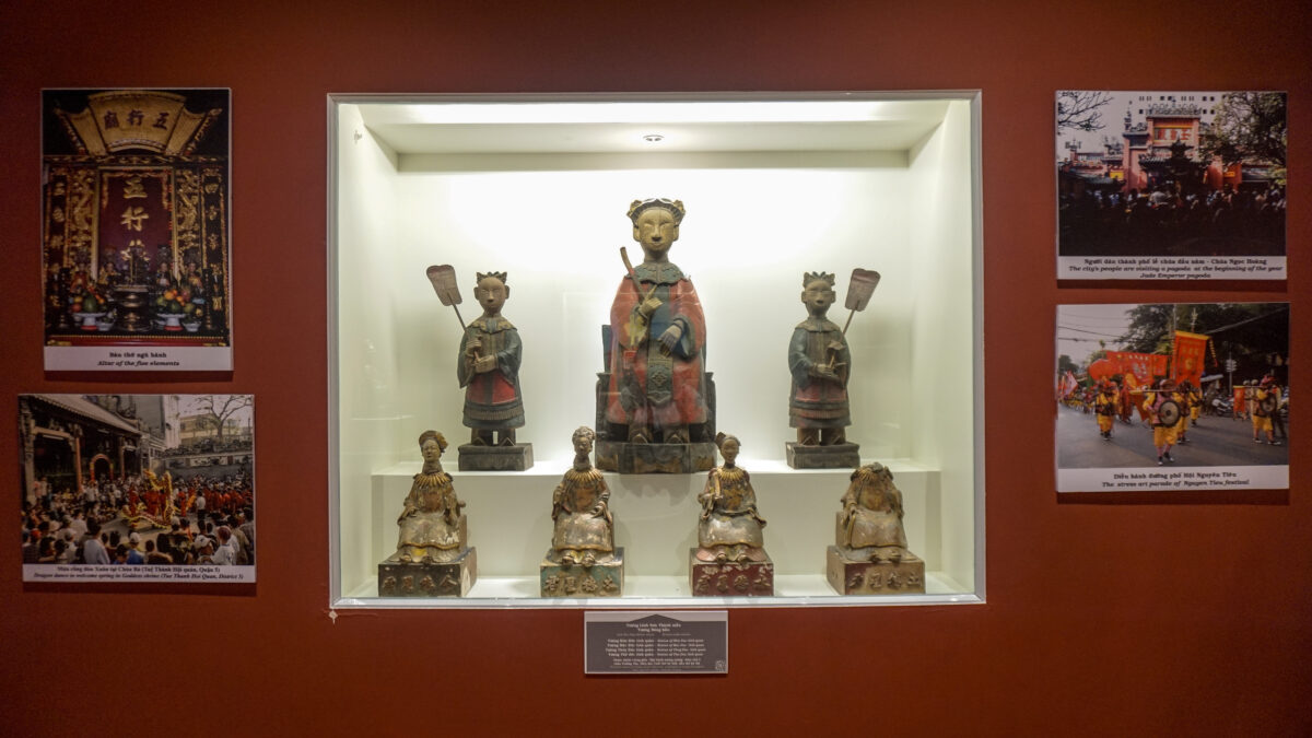 Tác phẩm 3: Trưng bày các pho tượng thờ Ngũ Hành, thể hiện tín ngưỡng dân gian quan trọng trong đời sống tâm linh của người dân. Xung quanh có ảnh tư liệu về lễ hội, rước kiệu.