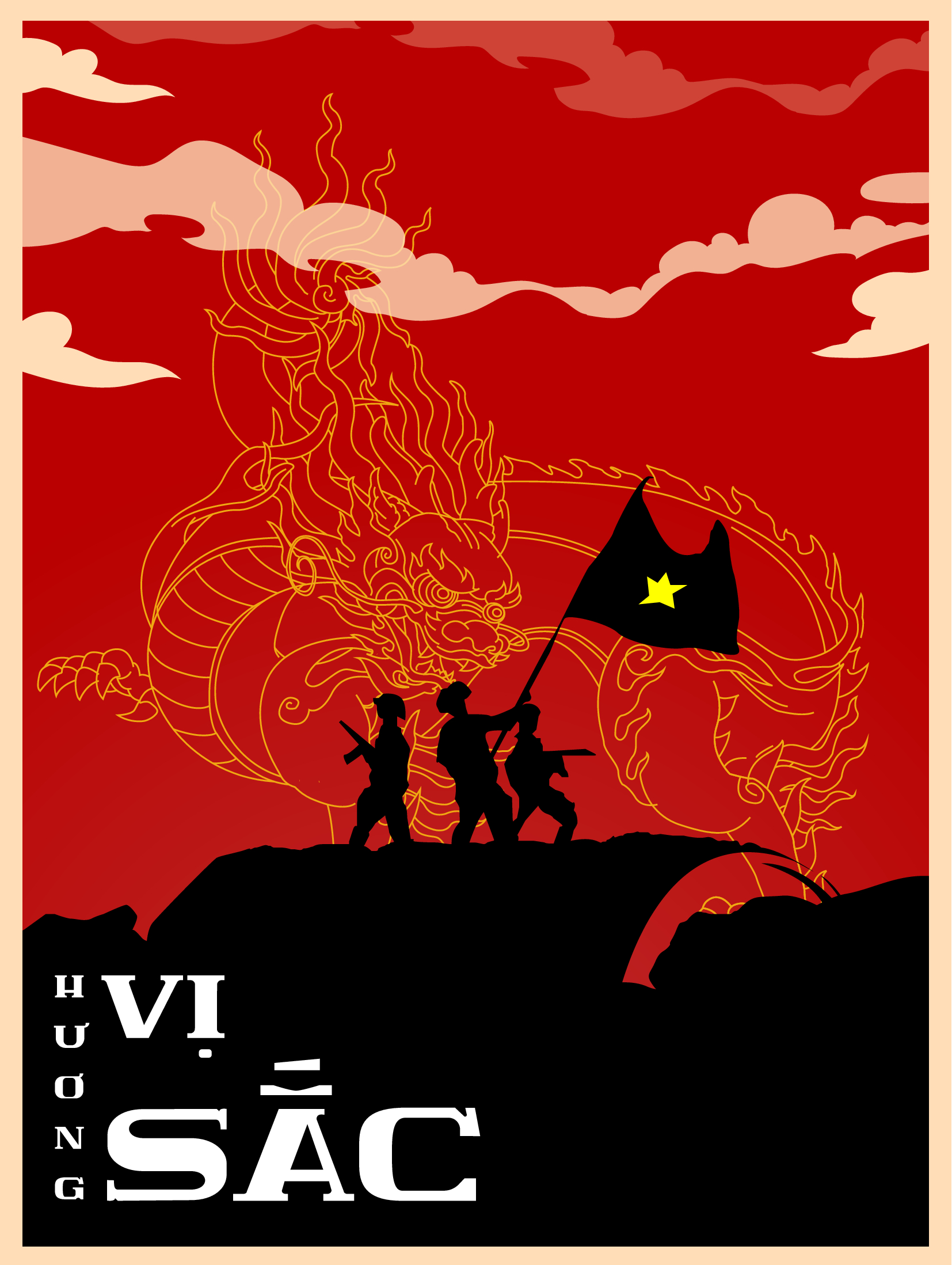 “Hương Sắc Vị” đúng như chủ đề của cuộc thi năm nay. Cả ba từ gộp lại tạo nên bản sắc văn hóa cũng như con người Việt Nam. Sau khi nghiên cứu và tìm tòi, em quyết định thiết kế poster, lấy bối cảnh chiến thắng Điện BIên Phủ năm 1954 (cuộc chiến vĩ đại của dân tộc ta). Cuộc chiến thể hiện được toàn bộ tinh thần, sự quyết tâm cũng như sự quả cảm của những người lính Việt Nam ta. Hình ảnh người lính cầm lá cờ đó chính là biểu tượng đủ ba chữ “Hương- Sắc-Vị”, vì màu cờ sắc áo, vì hương vị quê hương mà họ đã đứng lên để chiến đấu để giành lại độc lập. Để nhấn mạnh thêm được sự vĩ đại cũng như bản sắc văn hóa của Việt Nam, em đã sử dụng thêm hình ảnh rồng của Nhà Nguyễn, một sự thay đổi về ngoại hình thể hiện sự dũng mãnh, quyền lực sự kết hợp giữa long-lân-quy-phụng một nét nghệ thuật cũng như văn của Việt Nam ta.