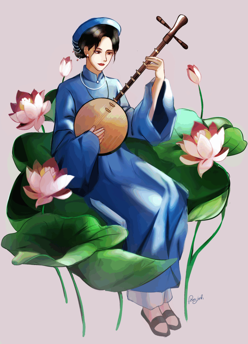 Bức tranh là lời ca ngợi vẻ đẹp truyền thống và tâm hồn nghệ sĩ Việt Nam – nơi con người, âm nhạc và thiên nhiên giao hoà thành một khúc nhạc bình yên giữa đất trời.