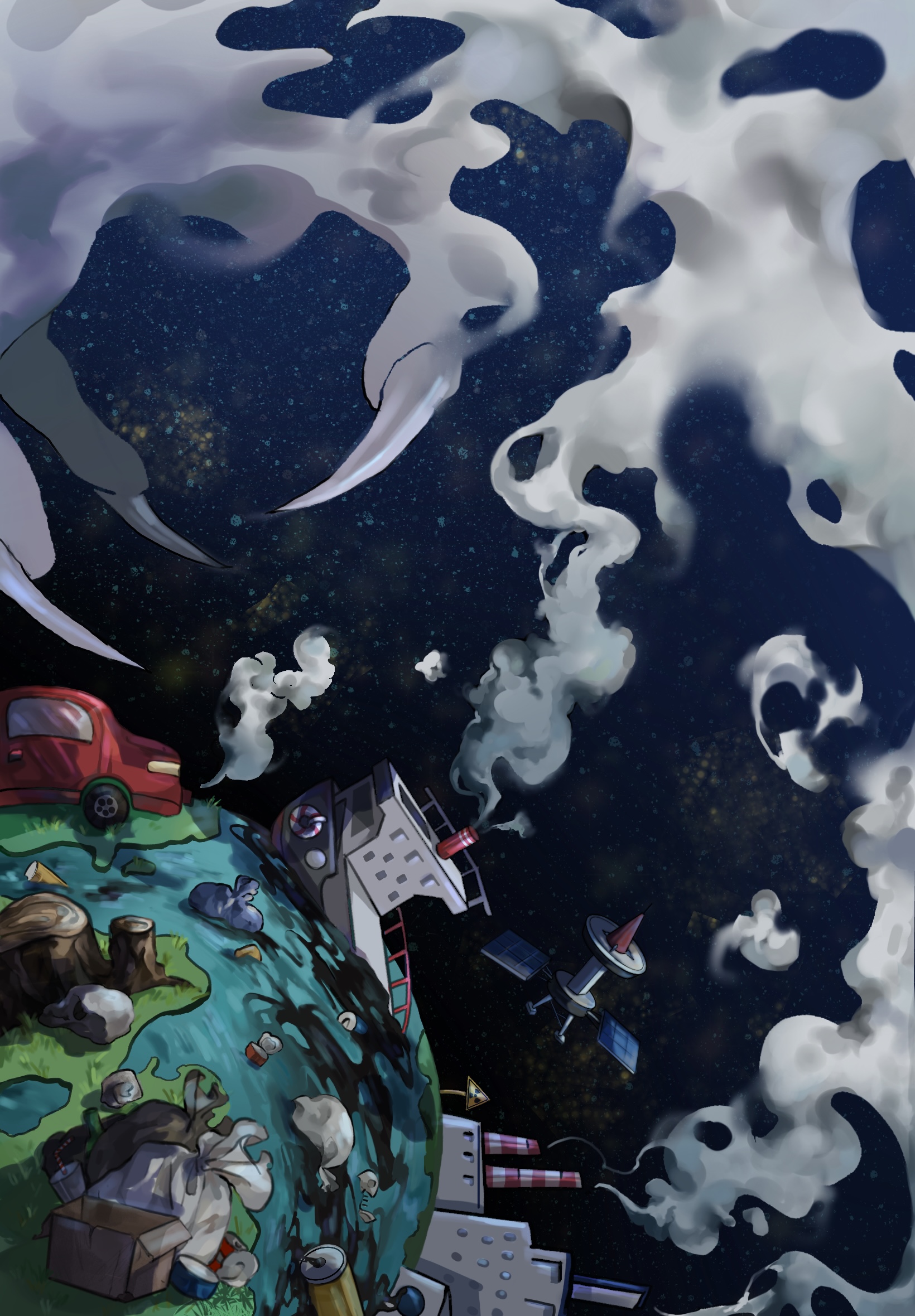 Tác phẩm mình vẽ mang tông màu trầm và có phần u ám mang lời cảnh báo về những nguy hại con người sẽ phải đối mặt. Chủ thể của bức tranh chính là Trái Đất bị ô nhiễm cùng làn khói độc thải ra môi trường từ các nhà máy, phương tiện giao thông đang biến thành một bàn tay đe dọa tấn công Trái Đất. Hiện nay tình trạng ô nhiễm môi trường ngày một nghiêm trọng ảnh hưởng trực tiếp tới sức khỏe và đời sống con người. Đặc biệt là ô nhiễm nguồn nước và ô nhiễm không khí, ô nhiễm đất đang trở thành vấn đề báo động ở Việt Nam nói riêng và thế giới nói chung. Các loại chất thải từ những hoạt động sản xuất công nghiệp, nông nghiệp và sinh hoạt của con người khi chưa được xử lý đúng cách và khoa học đã xả thẳng ra ngoài môi trường, từ đó ngấm sâu vào trong lòng đất và nguồn nước sinh hoạt hằng ngày. Theo thời gian, môi trường sẽ bị nhiễm bẩn cũng như suy thoái và làm ảnh hưởng xấu đến đời sống của động thực vật, con người. Vấn nạn này đã, đang và không ngừng là tác nhân gây ô nhiễm môi trường rất nghiêm trọng. Vậy rác thải nhựa là do đâu? Do chính lối sống sinh hoạt, thói quen tiêu thụ quá nhiều đồ nhựa của con người. Trong bức tranh mình có đề cập đến hình ảnh một con tàu đang bị chìm và nhà máy thải dầu,nước thải tràn ra xung quanh gây ô nhiễm môi trường biển, ảnh hưởng nghiêm trọng đến các hệ sinh thái. Đặc biệt là hệ sinh thái rừng ngập mặn, cỏ biển, vùng triều bãi cát, đầm phá và các rặng san hô và cũng gây ảnh hưởng đến môi trường sống của các loài sinh vật dưới nước. Không những vậy ô nhiễm không khí còn làm mắt cân bằng hệ sinh thái, biến đổi khí hậu và một loại những hệ lụy. Và nguyên nhân lớn nhất là từ con người,do các ngành công nghiệp và phương tiện giao thông, đốt rác thải… Mối quan hệ giữa con người và trái đất luôn là mối quan hệ khăng khít với nhau, trong đó giới tự nhiên làm tiền đề cho con người tồn tại và phát triển. Tuy nhiên con người đang đe dọa và hủy hoại chính môi trường sống và tương lai của nhân loại. Dân số tăng đồng nghĩa với nhu cầu về thực phẩm tăng, lượng rác thải cũng theo đó tăng lên. Các ngành công nghiệp hoạt động hết công suất để phục vụ con người. Tài nguyên bị rút cạn. Trái Đất dần kiệt quệ. Trước khi quá muộn, hãy tích cực thực hiện những hành động tuy vô cùng đơn giản nhưng sẽ có tác động lớn giúp bảo vệ môi trường xanh sạch như không xả rác bừa bãi, phân loại rác thải sinh hoạt, hạn chế sử dụng sản phẩm nhựa, nilon khó tiêu hủy.