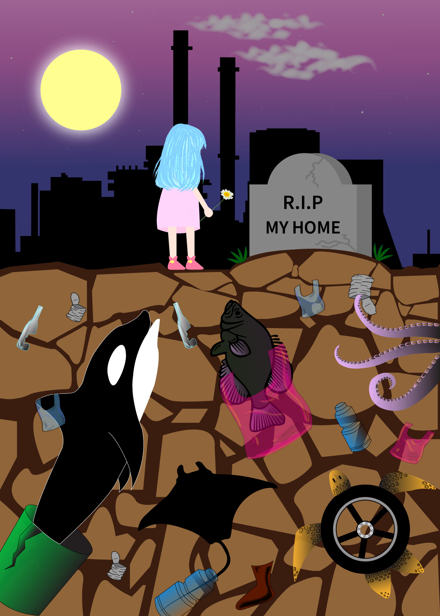 Trẻ em là biểu tượng của tương lai, trước hình ảnh thành phố ô nhiễm, một thế hệ trẻ với sự thương tiếc trước nấm mồ của hệ sinh thái. Phía dưới là hình ảnh các sinh vật cùng hướng ánh mắt nhìn vào đứa bé – là sự kỳ vọng về một sự cứu rỗi của thế hệ mới.