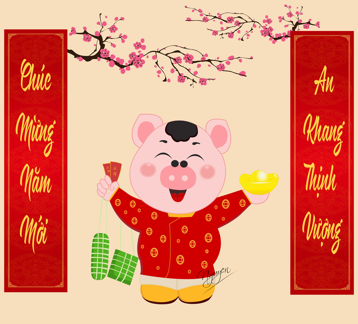 Những ngày nghỉ tết ngoài phụ giúp gia đình, thời gian rảnh mình đã vẽ nên bức tranh minh họa hình chú heo con này bằng phần mềm Adobe Illustrator, sau đó gửi tặng đến người thân yêu, cầu chúc mọi người năm mới hạnh phúc, vui vẻ.