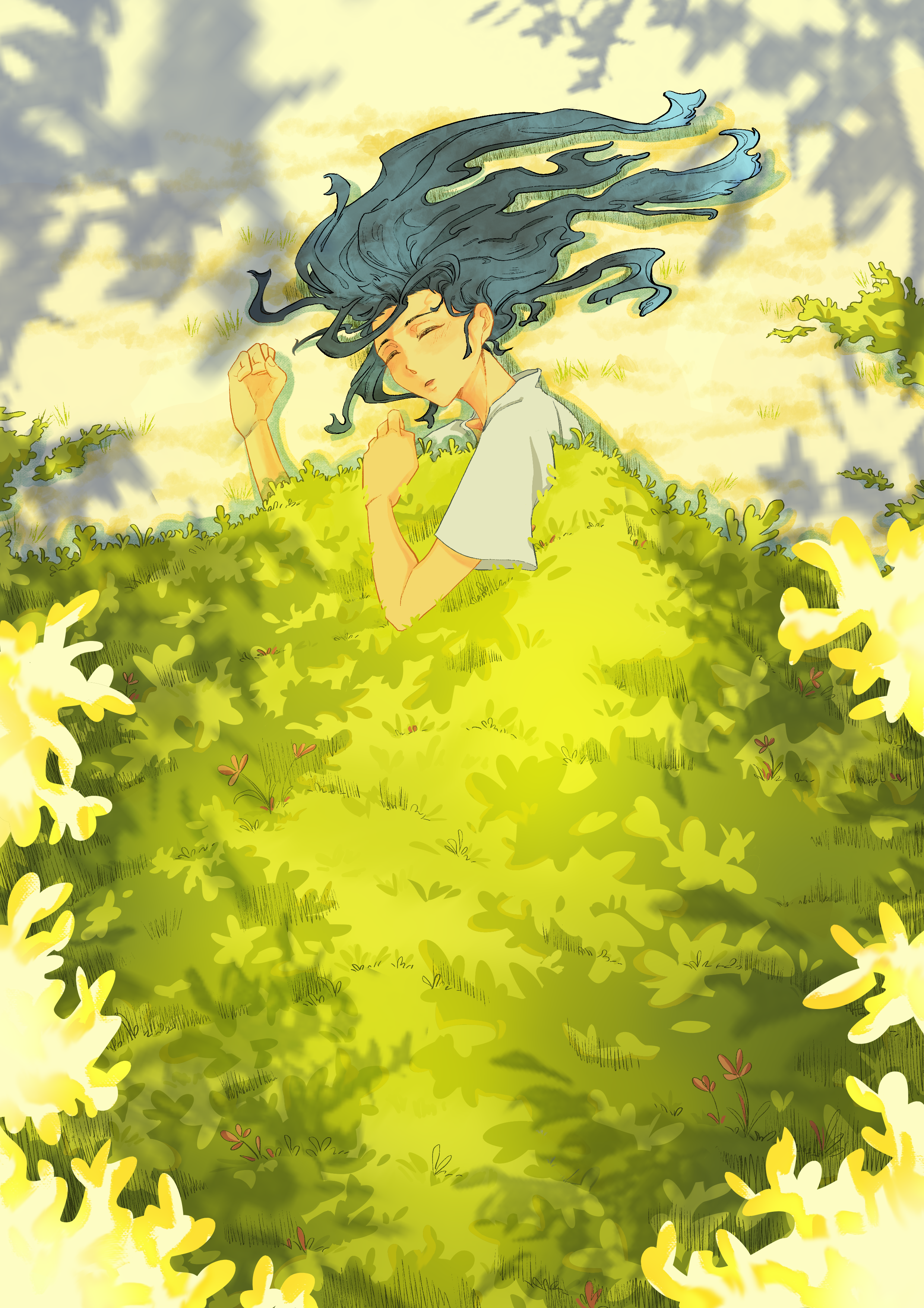Tác phẩm “Giấc mơ trưa”: Bức tranh này được mình lấy cảm hứng từ bài hát “Giấc mơ trưa”. Một giấc mơ nơi em được nắng, được gió, được cánh rừng ôm trọn, và cũng như em được hòa mình vào thiên nhiên đất trời.