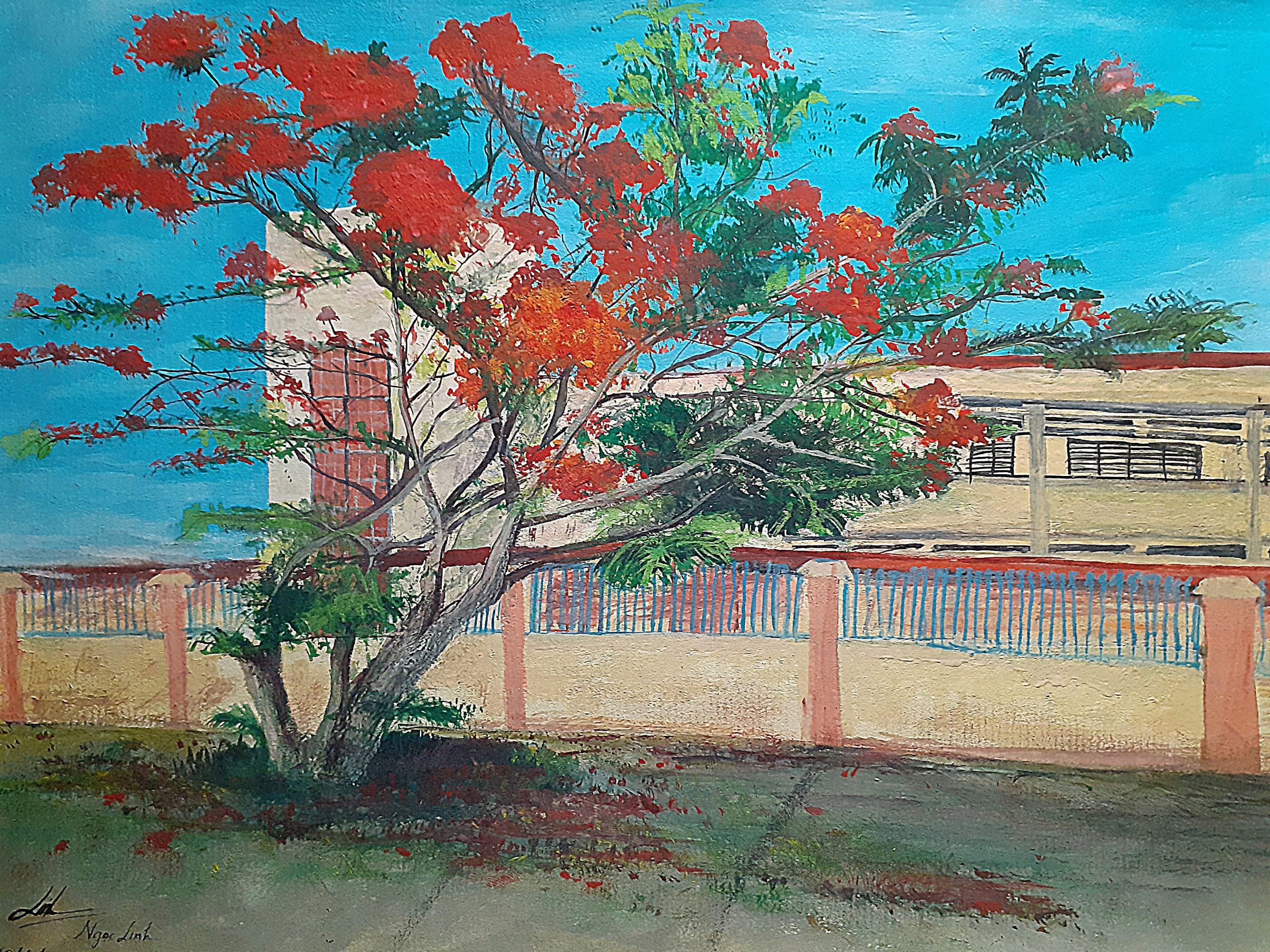 Tác phẩm thứ hai là tác phẩm ngoài dự kiến. Mình chỉ ý định nộp một tác phẩm thôi. Nhưng chắc bạn đã thấy về tin nóng hiện nay về cây phượng đè chết một học sinh. Rồi hàng loạt hình ảnh cây phượng bị chặt đi. Nó khiến chúng ta phải tiếc nuối. Nghĩ thử xem phượng là biểu tượng của hè trong nhiều năm như vậy rồi. Nếu không còn phượng nữa thì mùa hè có còn vui không. Bức tranh đó là mình vẽ lại cây phượng trước cổng trường mình. Đó là lần đầu tiên mình thấy nó nở đẹp đến thế. Mọi sự nuối tiếc, buồn bã giờ lại đến… không biết mai này cây phượng sẽ còn tồn tại trong sân trường nữa hay không. Không biết phượng này đây có đủ sức chống chọi với mọi điều không. Chỉ mong là cây phượng sẽ tươi tốt sống đời đời để che nắng che mưa cho bao thế hệ mai sau.