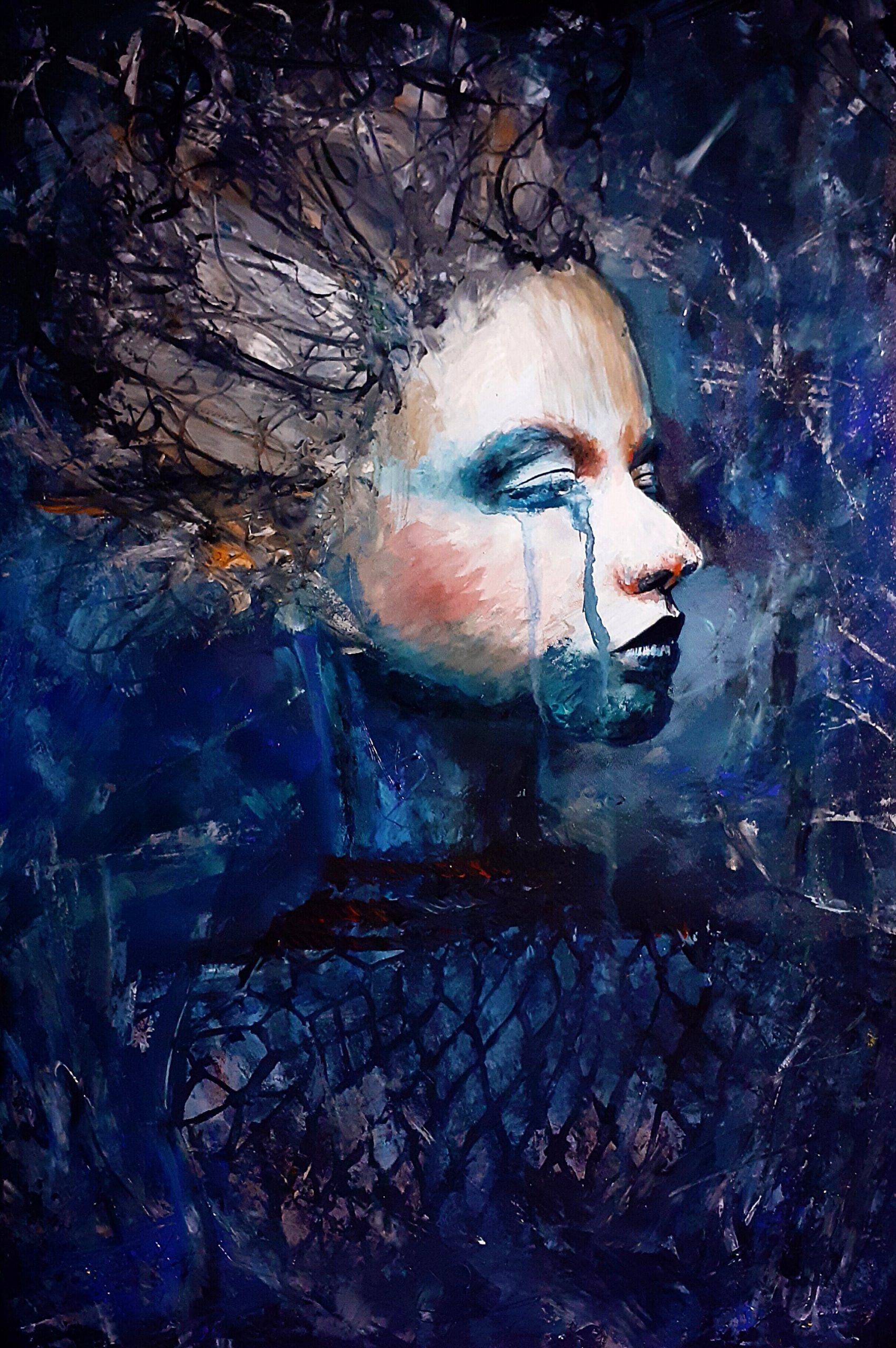 Tác phẩm thứ nhất là tác phẩm mà mình nghĩ ít ai sẽ thích. Vì nó theo cách vẽ hơi đáng sợ cho người xem. Không phải tự nhiên mình nói thế đâu. Mọi người xung quanh mình cảm thấy thế. Nhưng không sao mình thích nó. Mình muốn diễn tả cảm xúc của con người thông qua bức tranh này. Việc mà cảm xúc rối bời khiến chúng ta bế tắc và lúc đó chúng ta chẳng biết gì ngoài việc khóc hoặc là im lặng. Mình nghĩ trong đời của mỗi chúng ta sẽ có ít nhất một lần gặp tình trạng này hoặc là thường xuyên. Và lúc đó mình sẽ trói buộc bản thân lại, chẳng biết làm gì cả. Ý tưởng của bức tranh này là vì trong một lần lướt instagram mình vô tình theo dõi một nhiếp ảnh mỗi bức ảnh của người nghệ sĩ này luôn khiến người khác phải có cảm xúc đau đớn, tuyệt vọng rất khó chịu khi xem nó. Điều đó khiến cảm xúc mình rối loạn. Nên mình đã vẽ bức tranh này theo cảm xúc đó. Và việc cảm nhận nó như thế nào thì mình xin nhường lại cho bạn. Mỗi người có cách nhìn nhận riêng mà. Nên mình nghĩ mình sẽ không giải thích nhiều về nó.