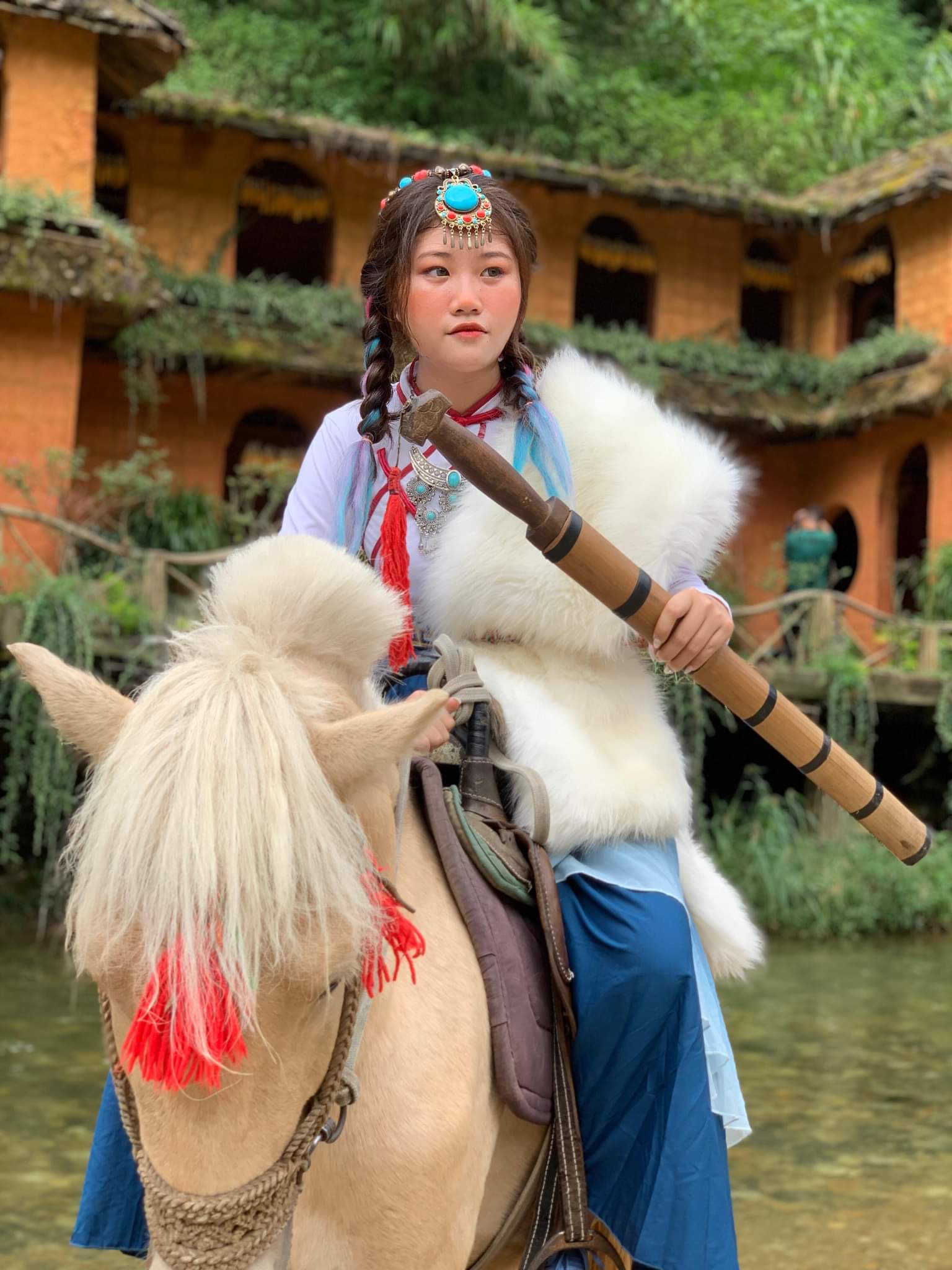 Trang phục của người con gái trong bức ảnh là một cô nàng trẻ trung, đầy nhiệt huyết nhưng cũng không kém phần dịu dàng. Màu sắc background em lấy khung cảnh nhà dân với tone nâu nhẹ nhàng. Cô gái nổi bật bởi chiếc áo trắng cùng những chi tiết xanh ngọc và đỏ.
