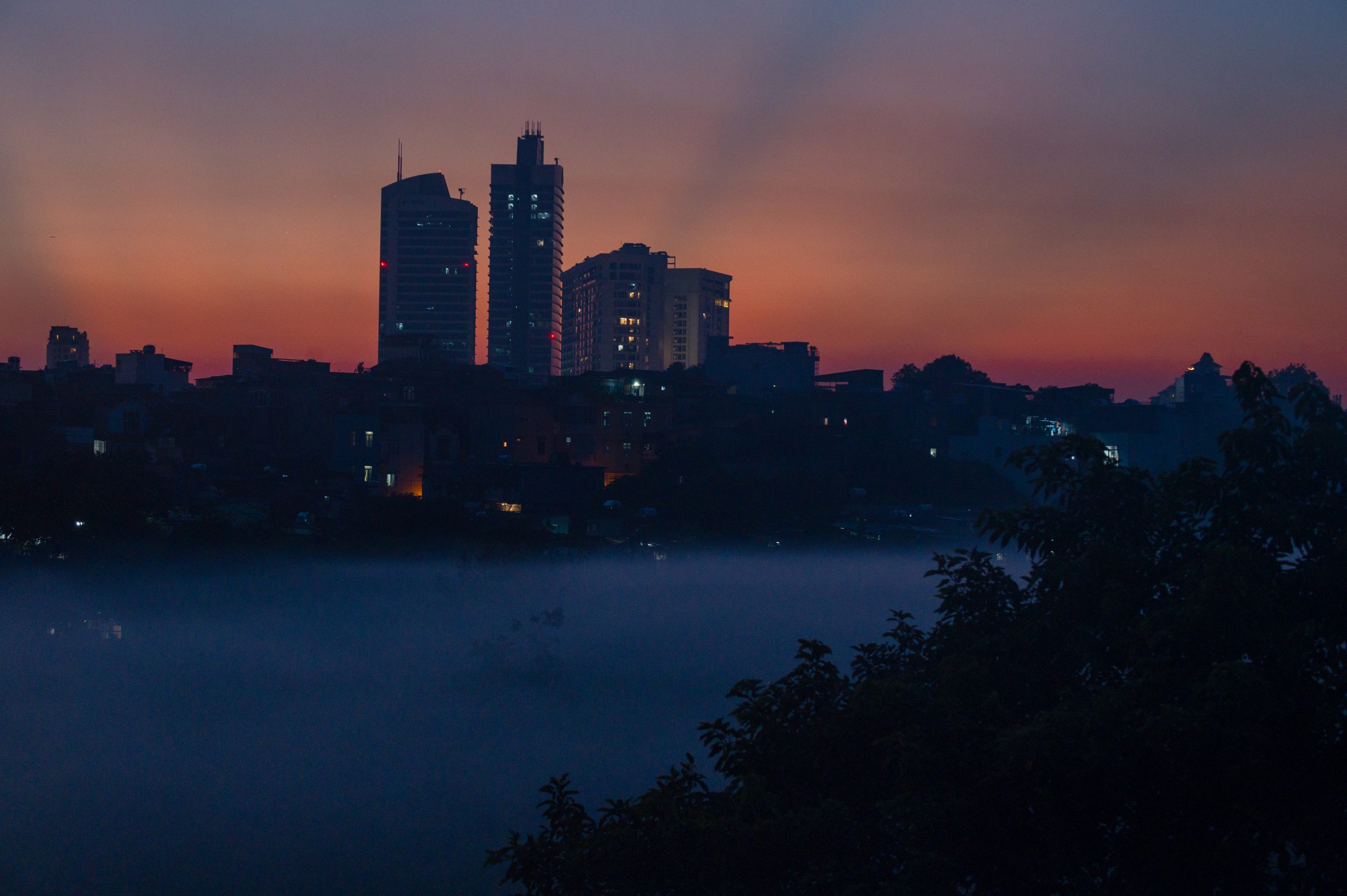 “Thành phố mờ sương” là tác phẩm được chụp từ cầu Long Biên hướng vào thành phố. Thoạt nhìn, bức ảnh ghi lại khoảnh khắc hoàng hôn lãng mạn cùng làn mây, sương trắng bồng bềnh trôi. Thực tế, bức ảnh này bắt được khoảnh khắc làn khói trắng bốc lên từ bãi phế thải đang được đốt dưới chân cầu Long Biên, đang dần bao trùm bầu không khí vốn đã ngột ngạt sau nhiều ngày nắng nóng liên tiếp ở thủ đô. Hà Nội đang được liệt kê vào danh sách những thành phố ô nhiễm không khí nặng nhất thế giới, với mức bụi gấp 5 lần tiêu chuẩn của WHO.