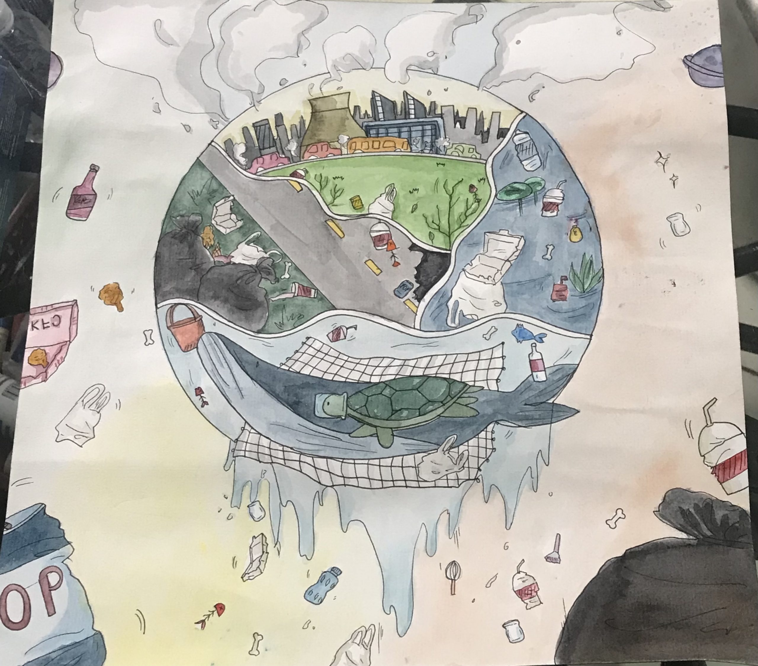 Tác phẩm của em được lấy ý tưởng từ những hiện thực dễ kiếm trong cuộc sống. Để có thể trải nghiệm được cuộc sống một cách toàn vẹn nhất, chúng ta chắc chắn phải trải qua hay cũng như là thấy được những mặt tối của việc đó để rồi khắc phục. Em cũng vậy, em cũng đã lấy những hiện thực khó khắc phục đó để vẽ nên vấn nạn cho mọi người hình dung, nắm bắt được sự khó khăn ấy của môi trường trong hiện nay. Tác phẩm của em chỉ xoay quanh những mặt tối của môi trường, ở những nơi được lên báo chí, du lịch, xa hoa, lộng lẫy nhưng không phải ai cũng biết được những ngóc ngách nhỏ của nó là đầy rẫy sự vô ý thức của con người, khiến cho môi trường dần bị tàn phá.