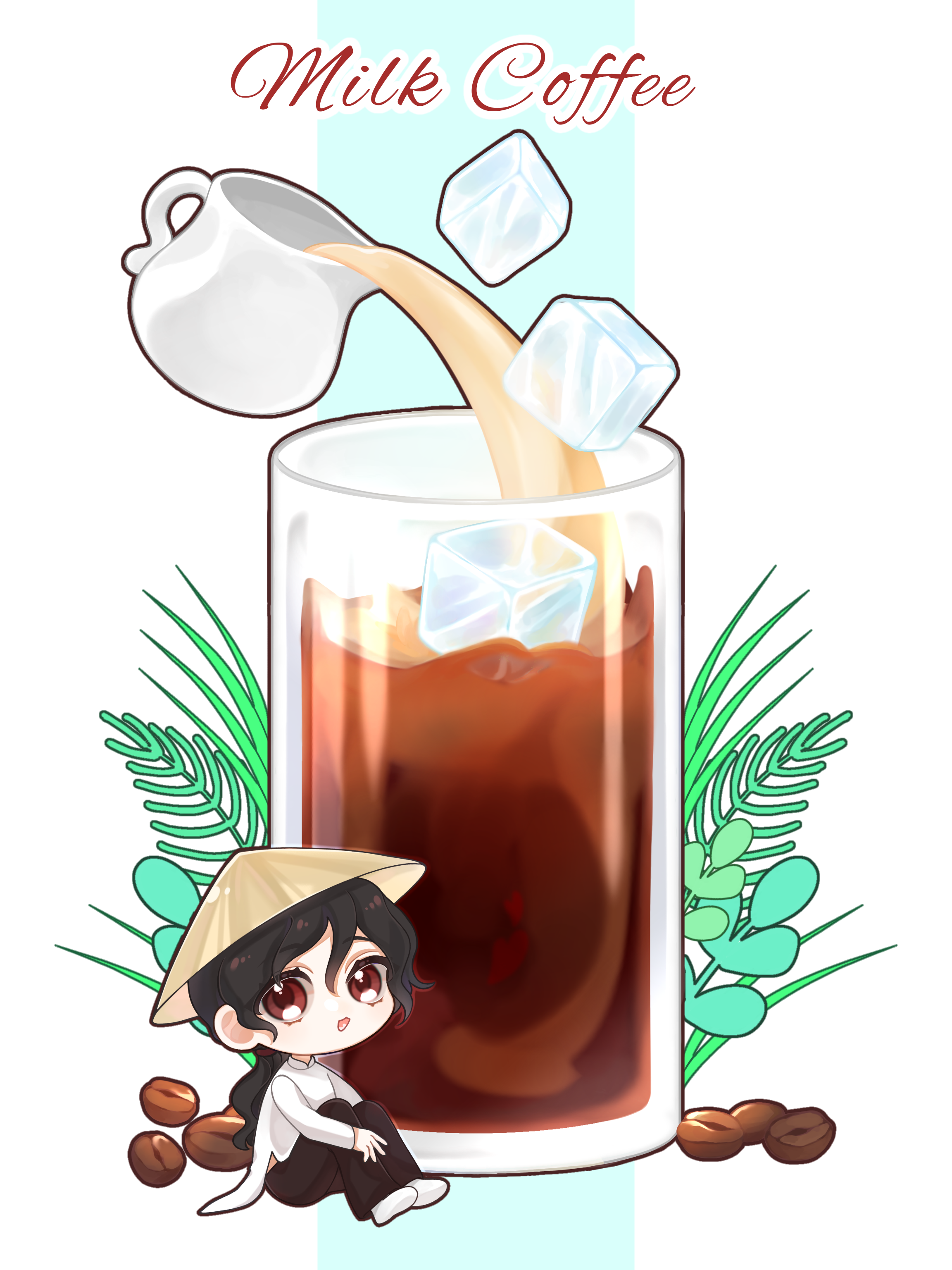 Việt Nam mình đã và đang sản xuất ra đa dạng các loại cà phê. Không cần biết đó là loại cà phê đắt tiền hay bình dân, loại nguyên chất hay đóng gói, đều rất đắng (đối với mình), vậy tại sao ta không cho thêm nhiều chút sữa để vị cà phê trở nên thanh ngọt dễ uống hơn? Đó là lý do tác phẩm này ra đời để thõa mãn cơn thèm của những bạn không uống được đắng như tác giả. Màu nâu đen hòa quyện cùng màu sữa vàng nhạt tạo cảm giác bớt nặng nề cho ly cà phê đen bình thường, vài viên đá óng ánh được thả xuống dành cho những người thích đồ uống mát lạnh, đồng thời giúp ly cà phê sữa trông bắt mắt hơn. Cô bé mặc áo dài kia chính là đại diện cho những tín đồ cà phê sữa, mong muốn được măm măm một ly cà phê ngọt ngào sau mỗi giờ tan trường (tan làm). Cảm giác mà ly cà phê sữa này mang lại cho cô bé cũng như chúng ta, là sự tỉnh táo và sảng khoái, giống như đang ở giữa rừng cây mát mẻ giữa khí trời nóng bức vậy. Màu sắc sáng sủa và tươi mới chính là màu sắc mà vị của cà phê sữa mang lại cho chúng ta: Thơm lừng, ngọt thanh và mát lạnh.