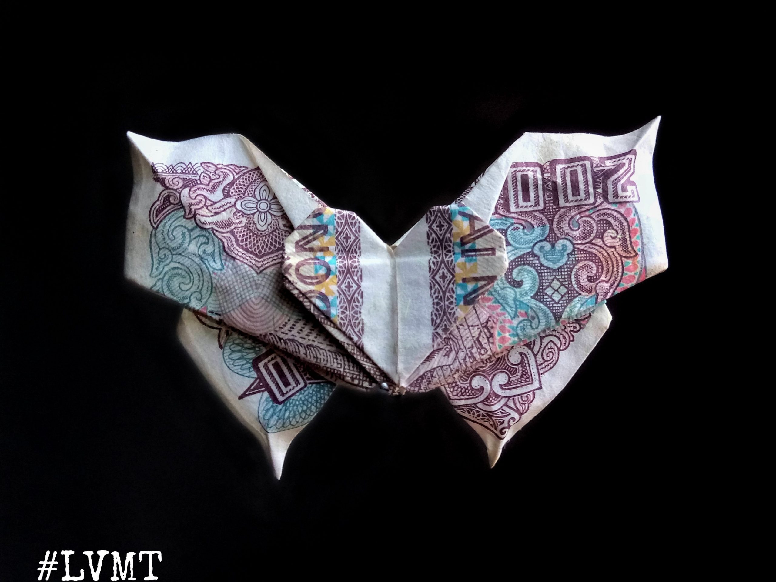 Một trái tim mang trên mình đôi cánh được gấp bằng tiền giấy không có sự can thiệp của keo hoặc cắt dán.