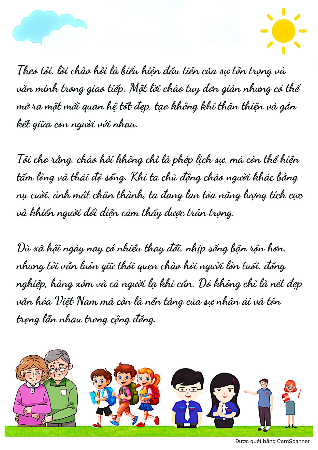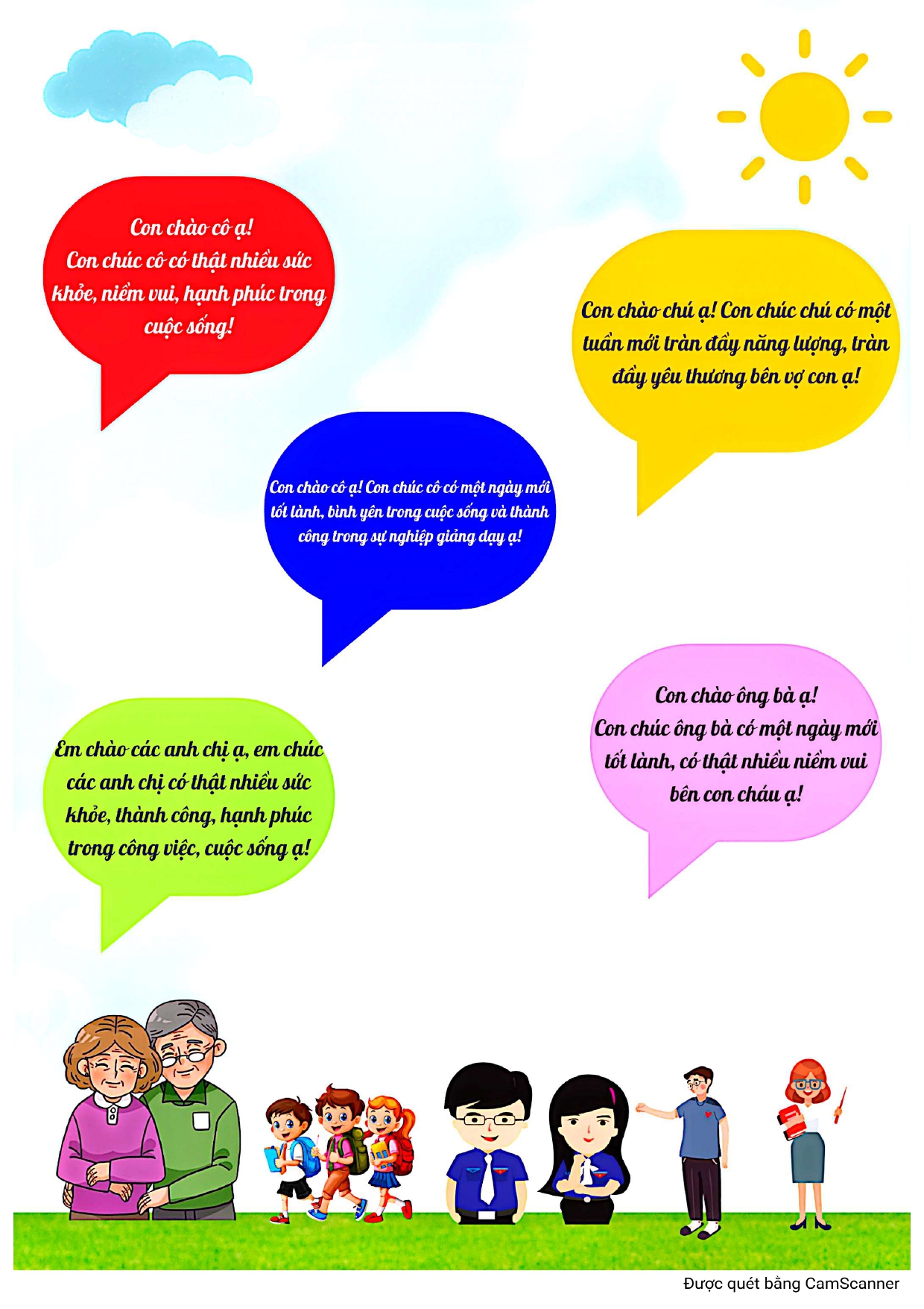 Poster, thêm chút hoạ tiết đại diện người dân Việt Nam từ trẻ đến già, mỗi người đều có cho mình lời chào, lời chúc sức khỏe, là một năng lượng tốt giúp mọi người có thể bắt tay vào công việc thuận lợi. Phía mặt sau, mình chèn quan điểm về giao tiếp ứng xử, cụ thể là lời chào (văn hoá chào hỏi), nhằm giáo dục con người về nét đẹp văn hóa của dân tộc Việt.