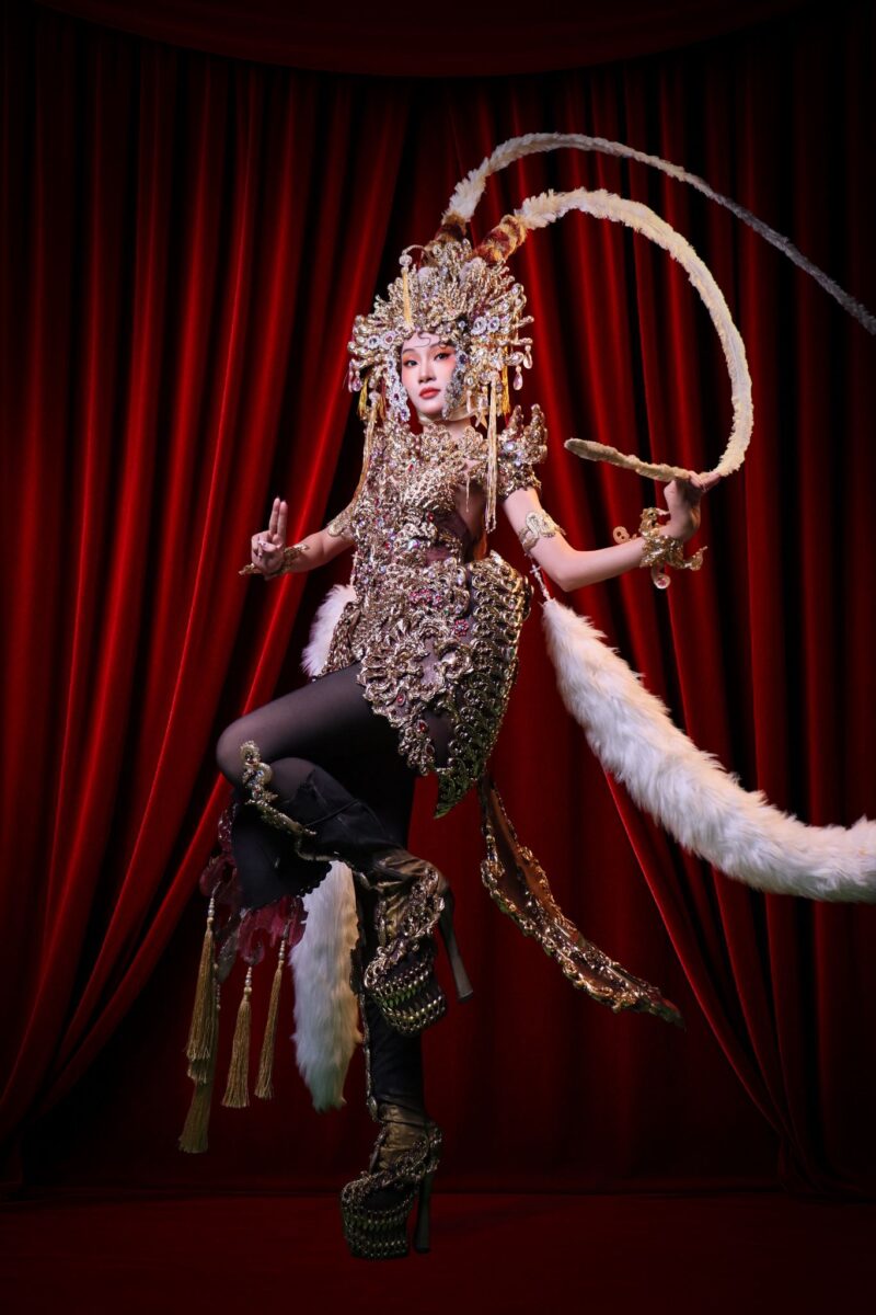 Bộ trang phục được cách điệu từ long bào và giáp hát bội, nhưng được biến tấu bằng chất liệu đính kết pha lê, kim loại, dây hạt và lông trắng – tượng trưng cho ánh lúa chín, phù sa và dòng sông đang chuyển mình.