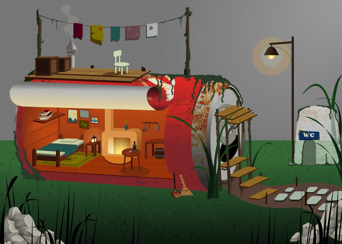 Bức tranh của em mang tính châm biếm lối sống con người ngày nay. Hình ảnh nổi bật sự ấm cúng – gọn gàng trong “ngôi nhà”, nhưng khi nhìn rộng ra bên ngoài chỉ là những rác thải mà chúng ta rất dễ bắt gặp ngoài đời sống ngày nay. Hai vật thể em đem vào bài thi là lon Coca và Ly nhựa: tượng trưng cho rác thải của con người. Bầu trời màu xám và 1 góc sáng nhỏ là hình ảnh khói bụi của nhà máy, xe cộ dày đặc không thể thấy được ánh sáng của tự nhiên.