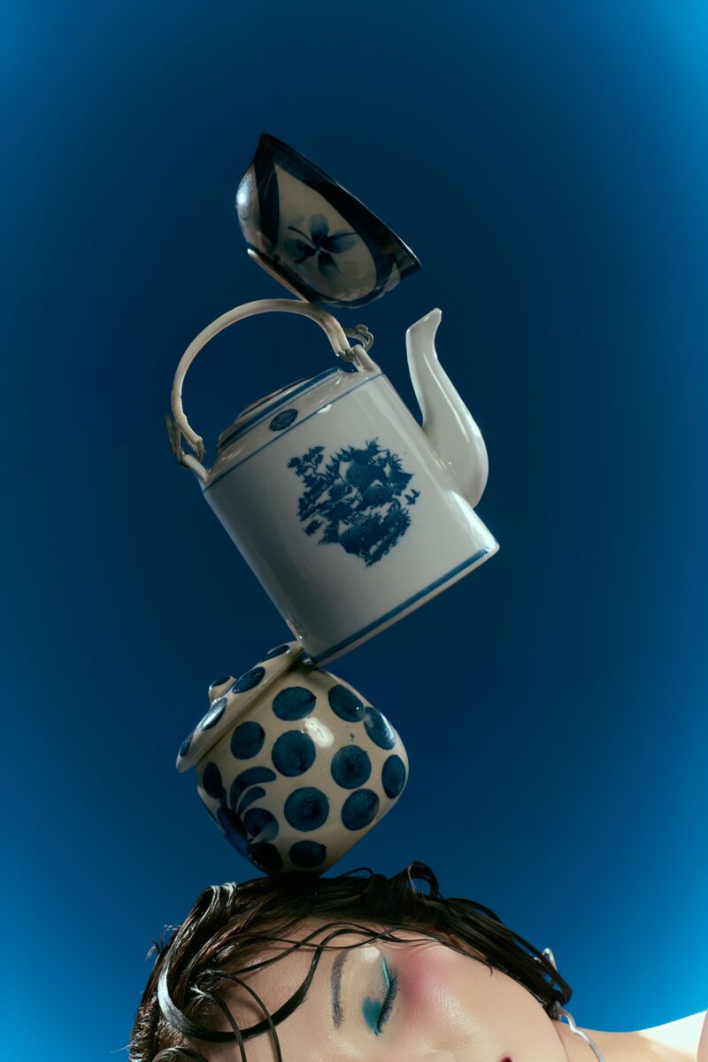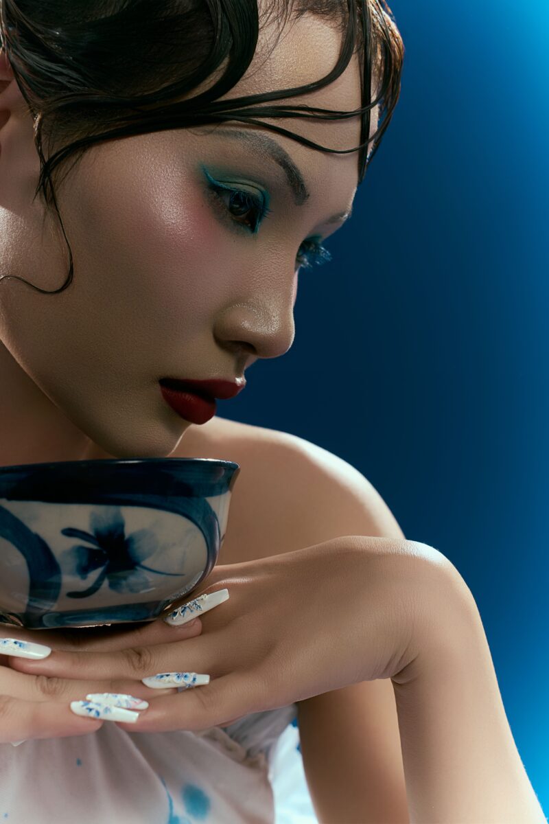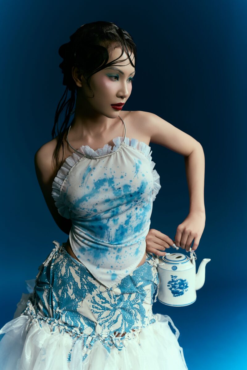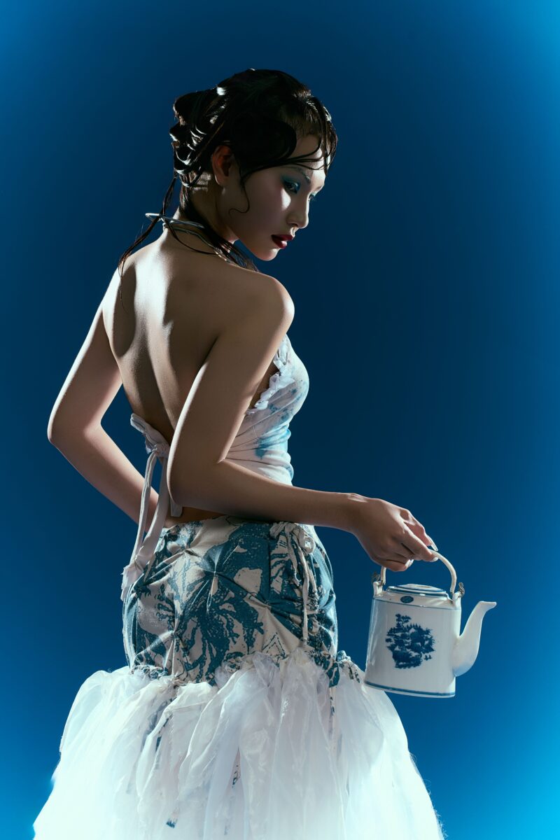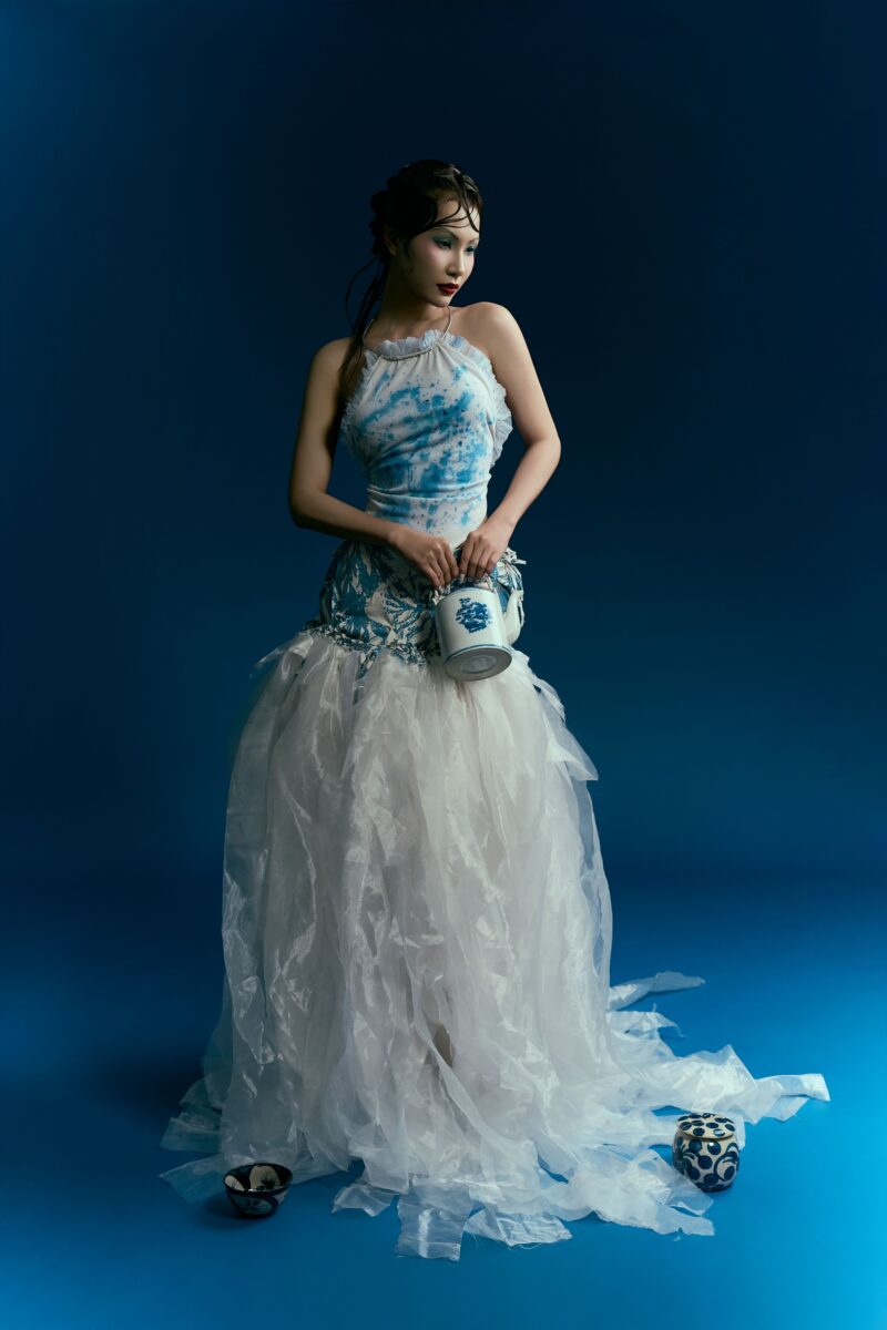 Bộ ảnh “Men Lam” là một dự án nhiếp ảnh thời trang sáng tạo, kết hợp di sản văn hóa Việt Nam với xu hướng bền vững đương đại, nhằm tạo ra một trải nghiệm kể chuyện bằng hình ảnh độc đáo. Ý tưởng lấy cảm hứng từ gốm sứ Bát Tràng vốn là sắc xanh chàm huyền bí trên nền sứ trắng ngọc nhưng được hiện đại hóa qua tái chế vật liệu cũ. Bộ trang phục không chỉ tái hiện màu sắc truyền thống mà còn nhấn mạnh khía cạnh lãng mạn của tái chế, biến vải thừa thành thiết kế kể câu chuyện về sự hồi sinh từ quá khứ, phản ánh trách nhiệm sáng tạo trong thời đại biến đổi khí hậu. Dưới ánh sáng xanh thẳm, người mẫu hiện lên như linh hồn thoát tục, khoác yếm và váy xếp nếp bay bổng như khói trắng trên men lam. Những vệt màu loang ngẫu hứng và nếp gấp tái chế tạo nên sự tương tác tinh tế giữa người phụ nữ, trang phục và đồ gốm sứ, tạo ra một lớp kể chuyện về bản sắc Việt. Dự án ảnh không chỉ là sản phẩm thời trang, mà còn là lời tự sự sâu sắc về giá trị di sản, khuyến khích khán giả trẻ trân trọng nghệ thuật thủ công Việt.