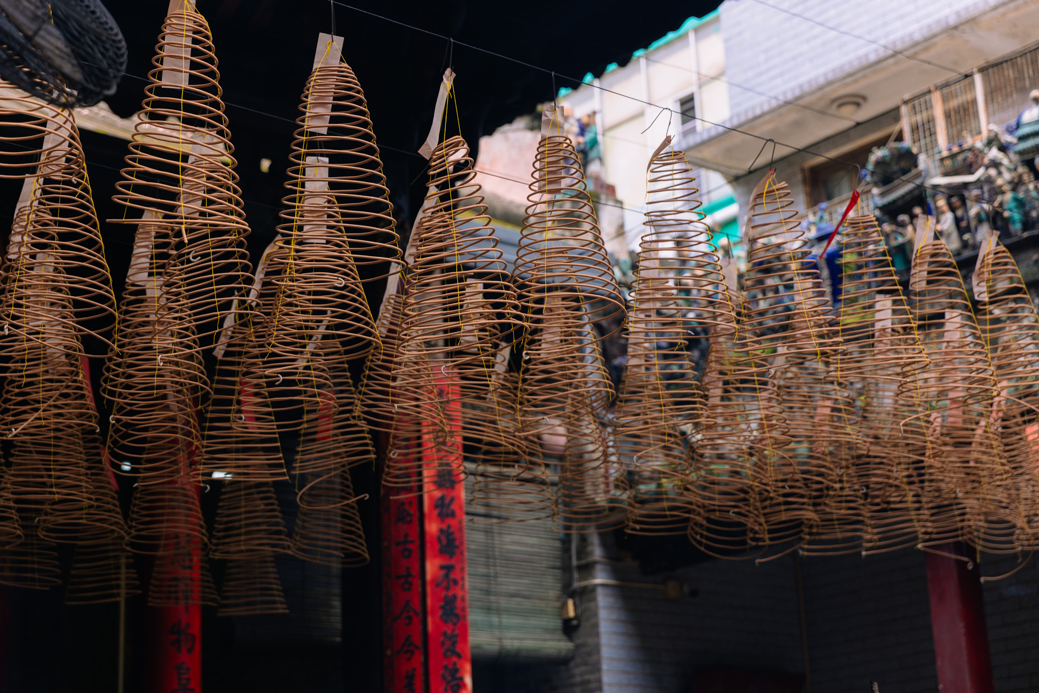 • Tín ngưỡng vòng nhang: Nét đặc sắc nhất, cũng là điểm nhấn trong bức ảnh của mình, chính là những vòng nhang lớn treo trên trần. Người đến viếng sẽ mua nhang, ghi tên tuổi và lời cầu nguyện lên một mảnh giấy đỏ rồi treo lên. Vòng nhang có thể cháy trong nhiều ngày, thậm chí cả tuần. Người ta tin rằng khi khói hương lan tỏa, lời cầu nguyện của họ sẽ được gửi đến các vị thần linh. Hình ảnh này tạo nên một không gian vừa linh thiêng, vừa ấm cúng và đầy hy vọng.