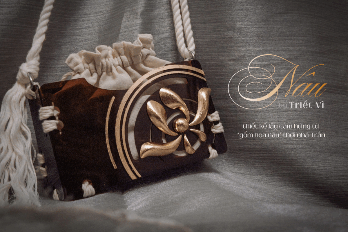 Tác phẩm: “Nâu” là 1 thiết kế phụ kiện thời trang hiện đại lấy cảm hứng từ hoa văn và gam màu của những chiếc bình gốm thời nhà Trần qua ngôn ngữ và chất liệu hiện đại như công nghệ khắc laser CNC trên miếng nhựa mica, công nghệ in 3D nhựa và kỹ thuật dát vàng. Qua thiết kế, mình muốn mang đến 1 tác phẩm vừa có tính ứng dụng cao mà vừa mang đậm cái “hồn” của lịch sử, của văn hóa truyền thống lâu đời.