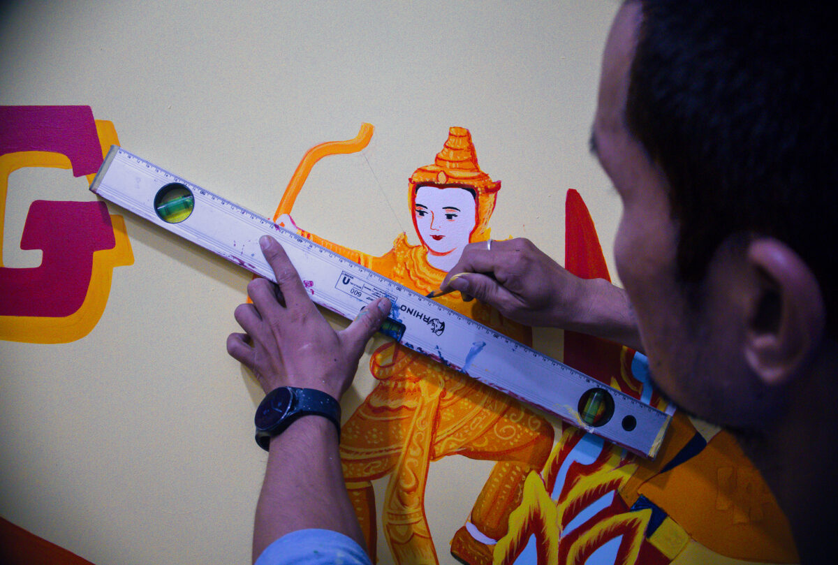 Hình ảnh chú đang vẽ những nét chi tiết cuối cùng, đầu cọ vàng chạm nhẹ lên nền đỏ đã khô, để lại một vệt sơn mỏng, đều và dứt khoát. Mùi dầu loang trong không khí, ánh sáng phản nhẹ lên lớp sơn còn ướt. Mọi thứ yên ắng đến lạ – không có tiếng cọ, chỉ có chuyển động chậm rãi của bàn tay và màu đang dần hòa vào nhau. Đó cũng là lúc bảng hiệu bắt đầu có cho mình linh hồn của riêng nó.