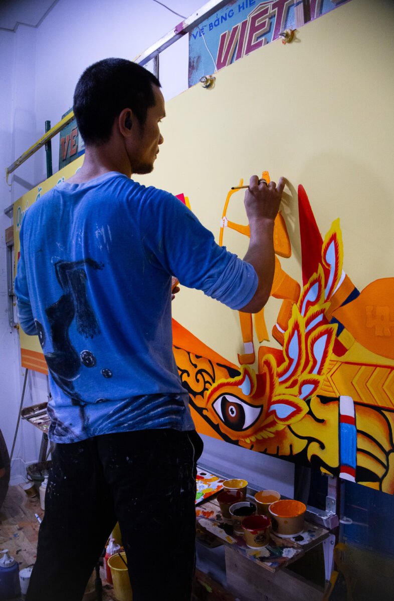 Nghề này nuôi sống chú, còn chú thì nuôi lại nghề bằng đôi tay và sự bền bỉ mỗi ngày. Mỗi đường cọ là một phần cơm áo, mà cũng là một phần tự hào. Nhìn chú, mình thấy rõ cái đức tính rất Việt của dân mình, cái tính cần cù, chịu thương chịu khó, lặng lẽ mà làm, không phô trương, chỉ cần làm cho tới, cho tròn. Cái đẹp ở đây không nằm trong màu sơn hay con chữ, mà là ở cách người ta sống hết lòng với công việc của mình.