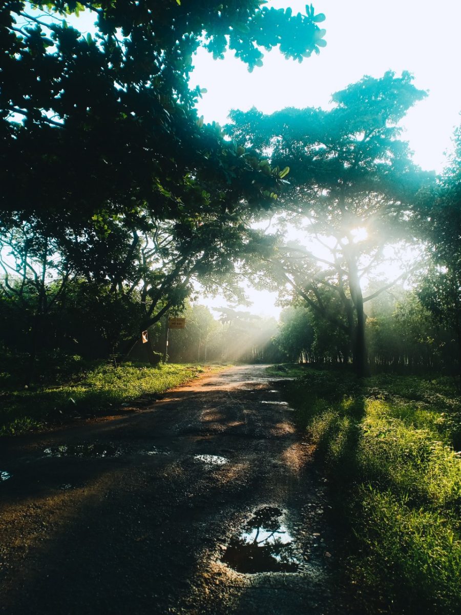 Bức ảnh miêu tả vẻ đẹp của một góc nhỏ của con đường quê, nơi mà sáng nào tôi cũng quen thuộc đến trường với hai bên là hàng cây xanh to khoẻ đang vươn mình sau cơn mưa đầu mùa dưới cái nắng ấm khiến lòng người cảm thấy thật bình yên. Đôi khi tôi tự nghĩ thiên nhiên là một kiệt tác đẹp nhất trên đời .