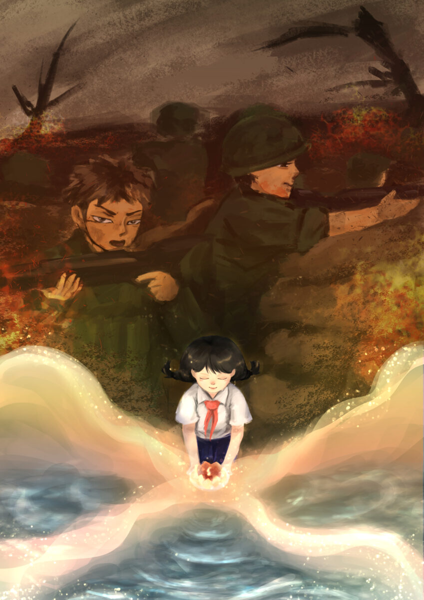 Phía trên bức tranh là miền ký ức rực lửa mà em từng được nghe kể, là khói bom mịt mù, đạn pháo dày đặc, là hình ảnh những người lính trẻ kiên cường chiến đấu giữa lằn ranh sinh tử. Còn phía dưới, nhân vật trung tâm chính là đại diện cho thế hệ trẻ bọn em – người đang cúi đầu thả đóa hoa đăng xuống dòng sông trong đêm lễ hội tưởng niệm.