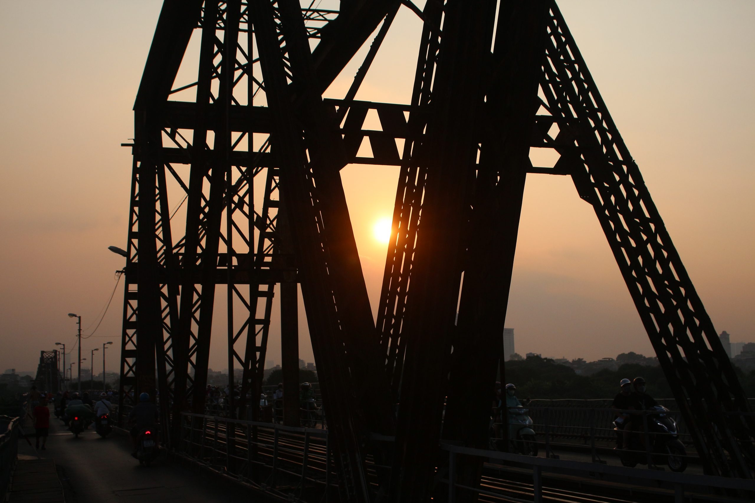 Khi con người ta dần trưởng thành, ta thường có xu hướng tìm về những nơi nguồn cội, nơi thân thương tưởng chừng như đã bị lãng quên theo năm tháng. Nếu như ngày bé chúng ta yêu thích những gam màu tương sáng như xanh đỏ tím vàng, thì đối với tôi, càng lớn lên, tôi càng cảm thấy có sự thân quen, sự yên bình với màu nâu cam vàng. Bạn biết vì sao không, ánh vàng thể hiện cho ánh mặt trời, màu cam là sự rực rỡ còn gam nâu là cái yên bình .Như một sự kết thúc sau hàng tá thứ bộn bề, tấp nập của Hà Nội, tôi tìm về cây cầu Long Biên, nơi chứng nhân lịch sự cũng là nơi giao thương đi lại của vô vàn người xa xứ, trong đó có cả tôi. Trong tâm hồn non nớt pha chút già cỗi của tuổi đôi mươi, tôi yêu cái hoàng hôn nơi cây cầu này, cái đẹp khiến tôi say đắm như say một nàng thơ: Dịu dàng, êm ái và yên bình. Nhưng nàng thơ trong tôi cũng là người có cảm xúc vui buồn như một cô gái, khi về đêm, nàng thơ ấy lặng thinh trong vắt. Là dòng chảy hồ gươm dịu êm phản chiếu sự ồn ào của những mảng màu chấm phá. Dữ dội như sự giận dỗi của nàng được giấu kín trong cái tĩnh và lặng mà chỉ có con mắt của kẻ si tình mới thấu tận con tim.