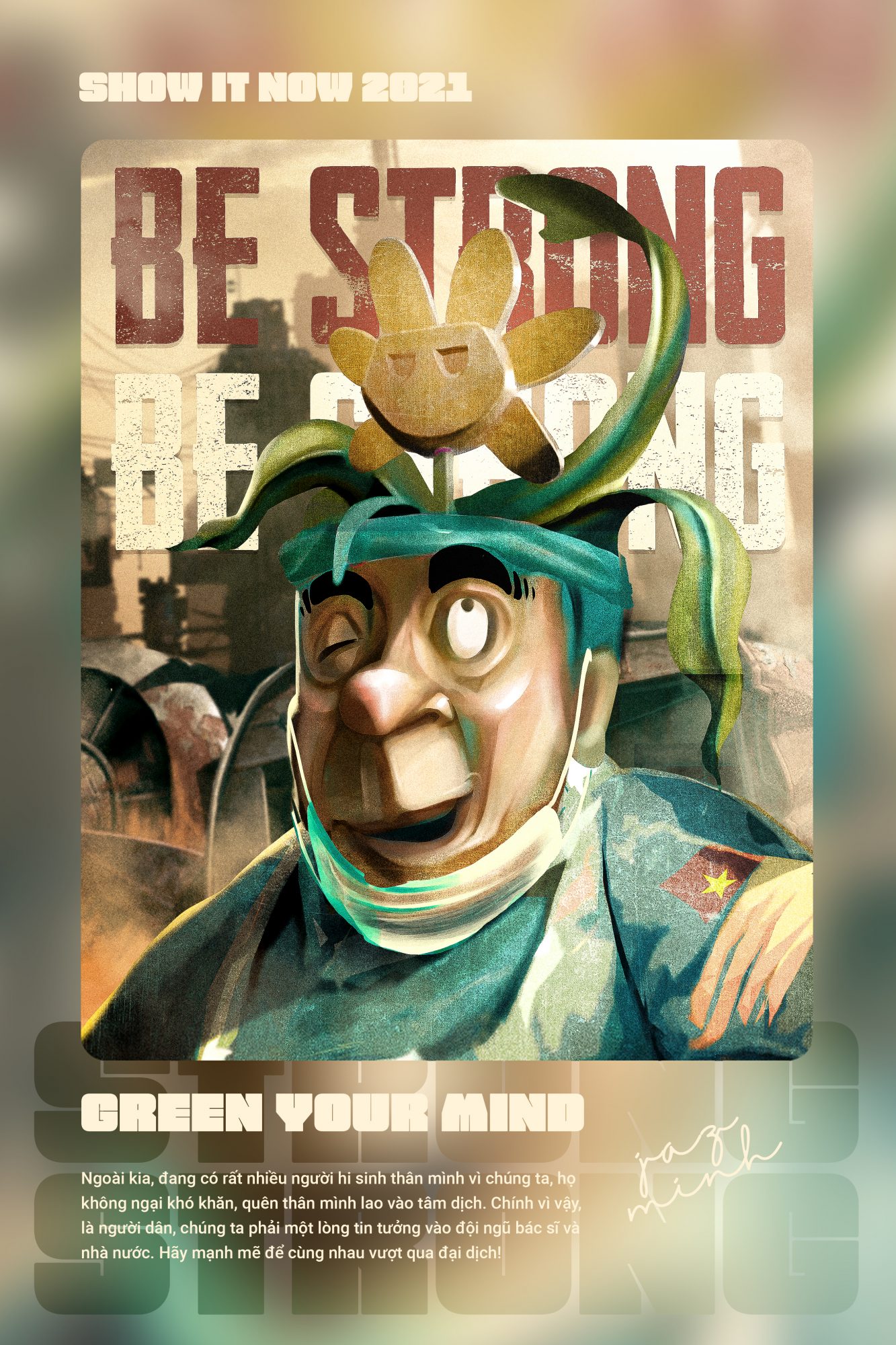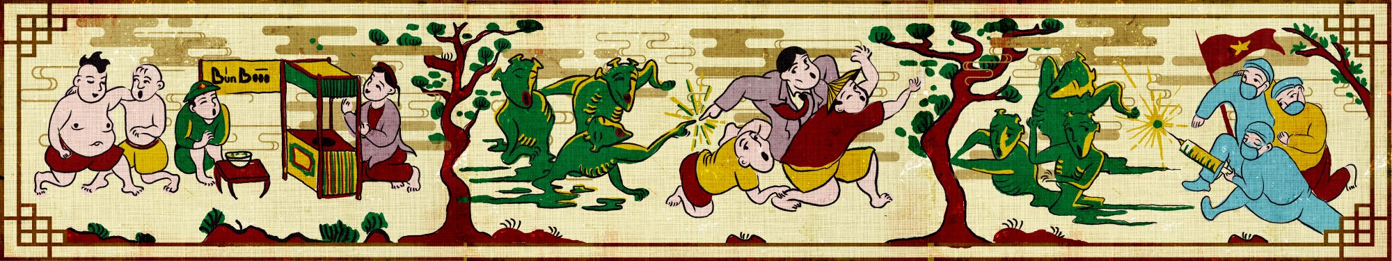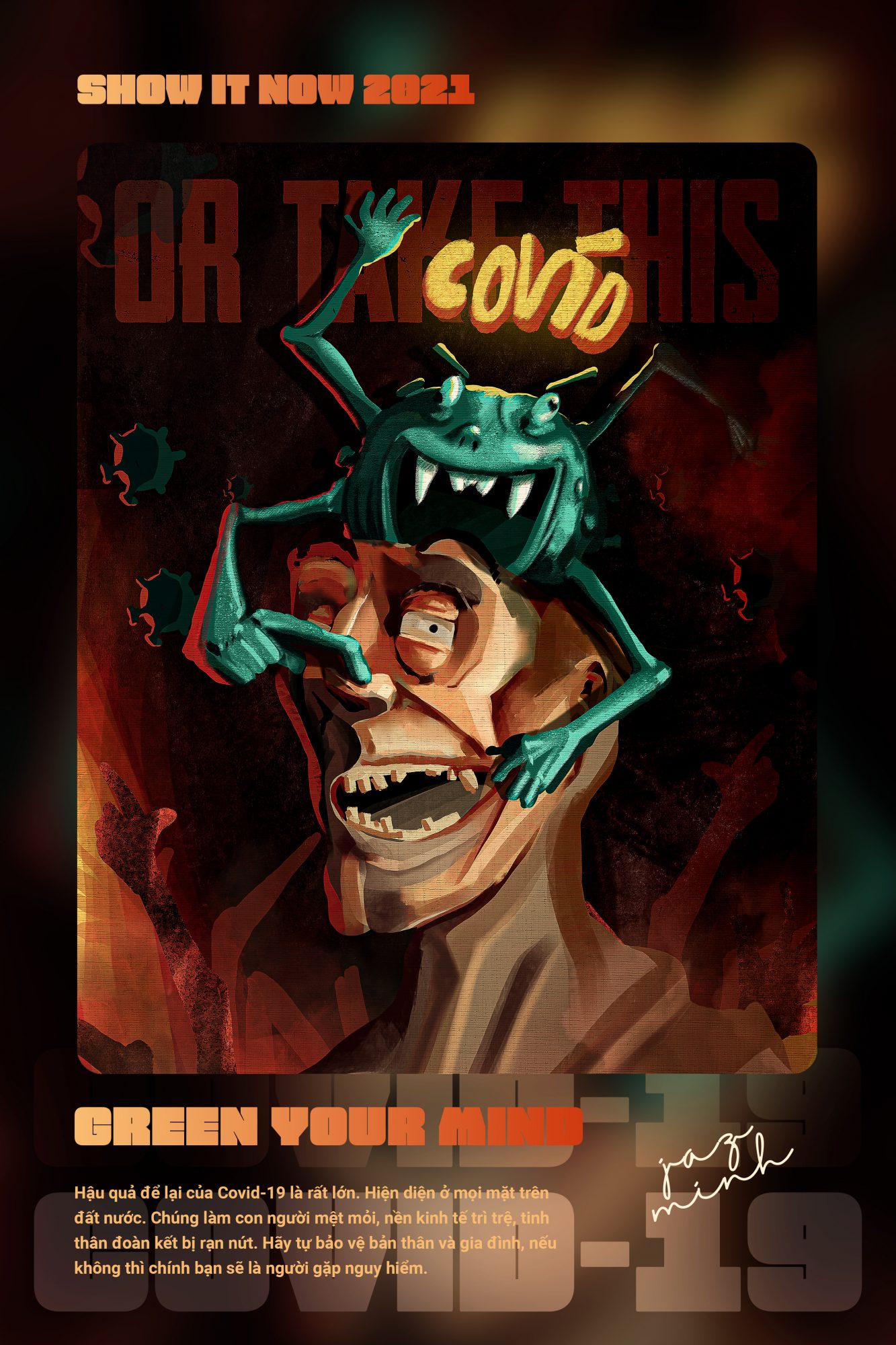 Mình mang tác phẩm đến cuộc thi với mong muốn tuyên truyền mạnh hơn nữa về mầm bệnh chết người kia. Tác phẩm là chuỗi ba tranh Đông Hồ với nội dung xoay quanh các mốc thời gian trước, đang, quá trình đánh tan đại dịch. Thổi vào đó là một chút tinh thần dân tộc, một chút tâm huyết và một chút cầu nguyện cho đất nước khỏe mạnh, mọi người bình an.