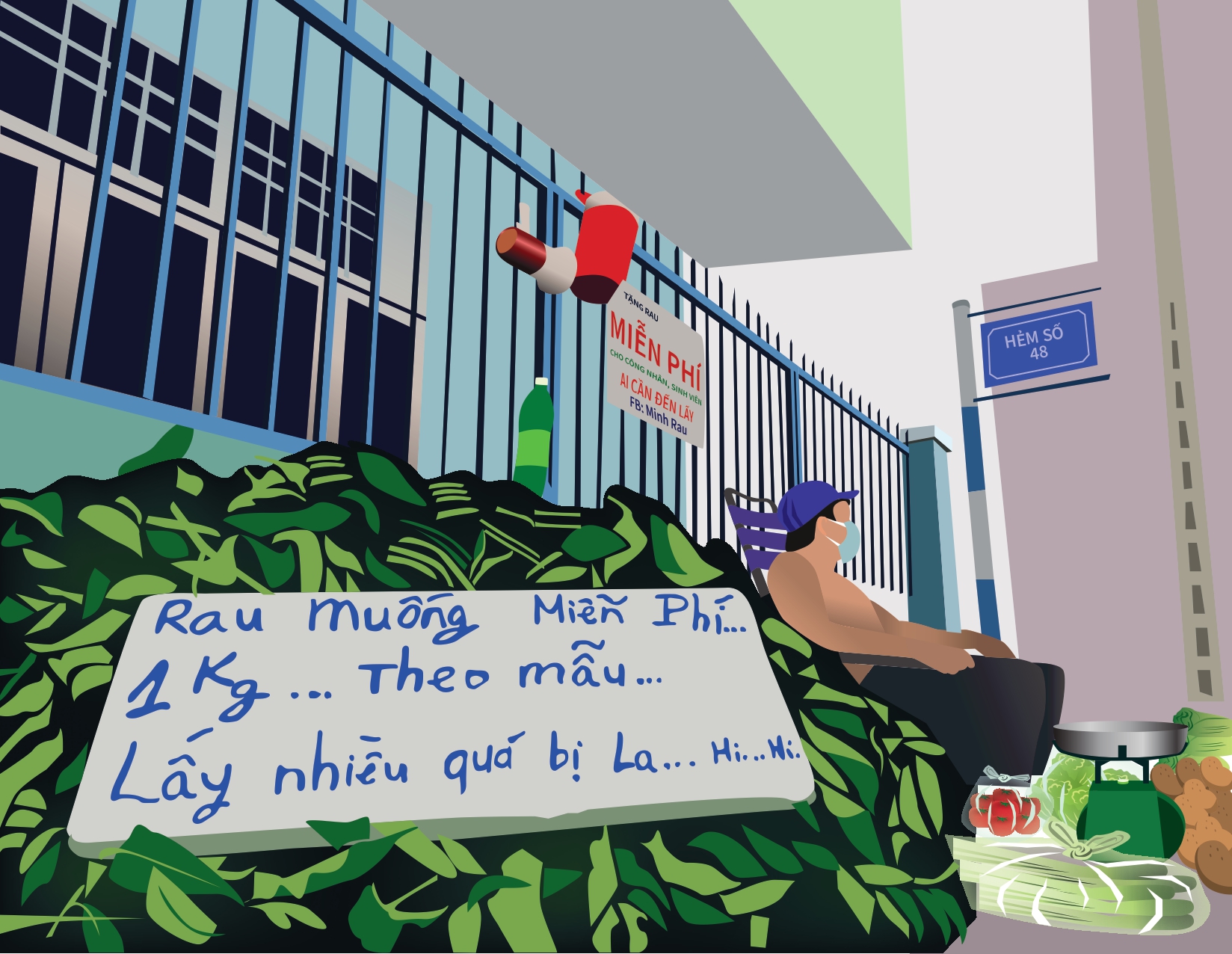 Riêng những ngày qua tôi có một suy nghĩ khó thổ thẹn về chính bản thân mình. Tôi đang là một người của thế hệ trẻ nhưng lại chẳng giúp ích được gì cho mọi người trong hoàn cảnh bây giờ ngoài việc ở nhà giãn cách theo các chỉ thị. Vì thế tôi chỉ có thể vẽ lại các nét đẹp của “Đồng bào Việt Nam” trong thời gian qua như là “ATM gạo”, “Siêu thị 0đ”, “Bếp ăn nghĩa tình”,… Để truyền trải được cái “green’’ đến mọi người , giữ được ngọn lửa nhiệt huyết yêu thương này. Vào những lúc yếu lòng chia rẽ hãy nhớ đến cái tình nghĩ con người đùm bọc trong thời gian qua. Tôi mong điều này sẽ là một chút động lực nhỏ cho các mạnh thường quân, các y bác và các bạn quân nhân hỗ trợ tuyến đầu. Để các anh chị cô chú luôn biết chúng tôi luôn nhớ về học và họ sẽ chiến đấu cùng chúng tôi chứ chưa hề cô đơn. Hãy luôn nở nụ cười nhé mọi người vì ta có được những con người Việt Nam tử tế.