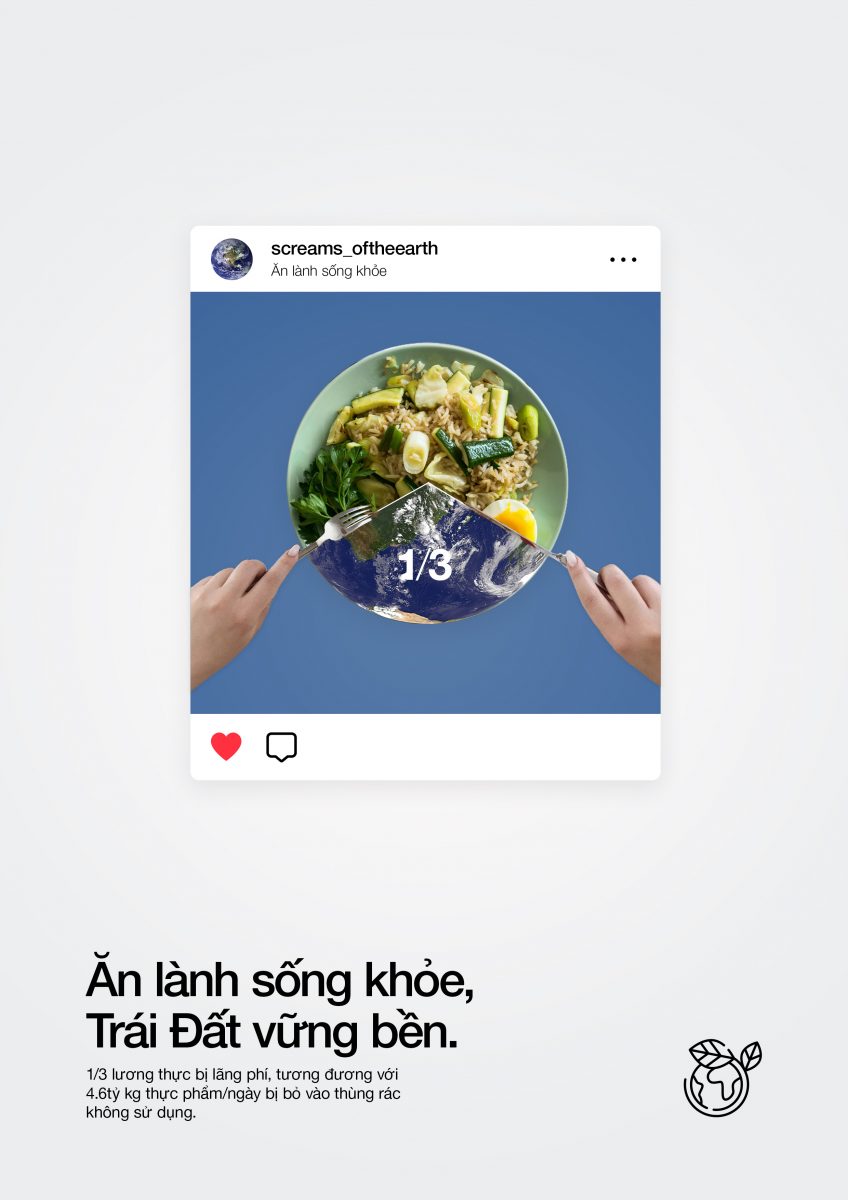 - Chú thích nhấn mạnh “ăn sạch” là bước đầu tiên hướng tới việc đảm bảo sức khỏe của chính mình đồng thời nuôi dưỡng một Trái đất bền vững cho các thế hệ mai sau.