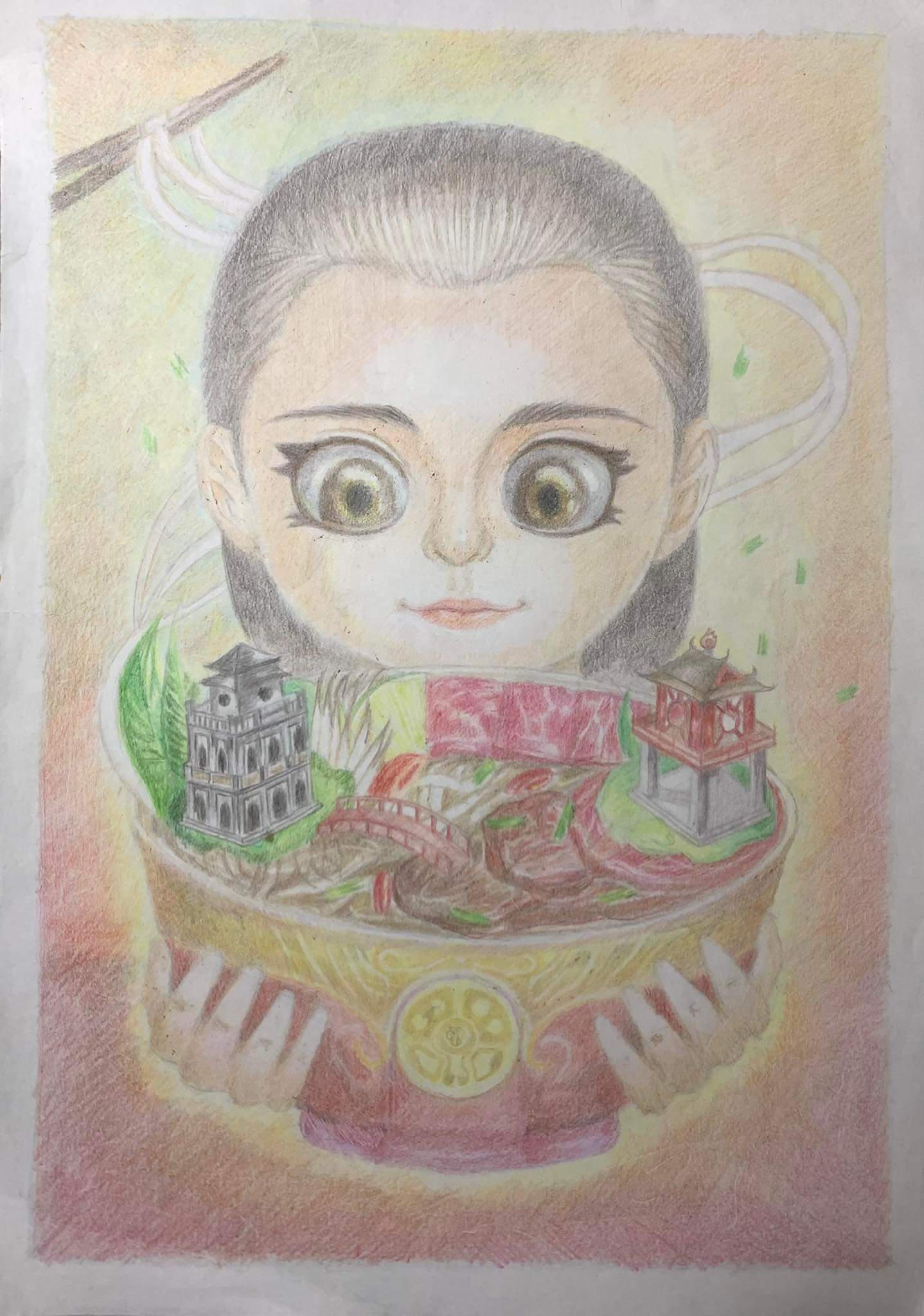 Đây là một bức tranh về cô bé cầm bát phở đang hồi tưởng về kí ức và mùi hương quyến rũ của phở.