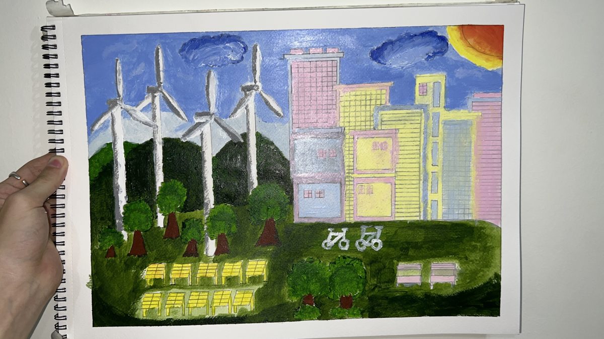 Bài thi của em muốn nói về Thành Phố Xanh, một bên sẽ là những Tuabin điện gió sẽ tạo ra nguồn điện sạch cho thành phố ở bên cạnh, giúp giảm ô nhiễm không khí.