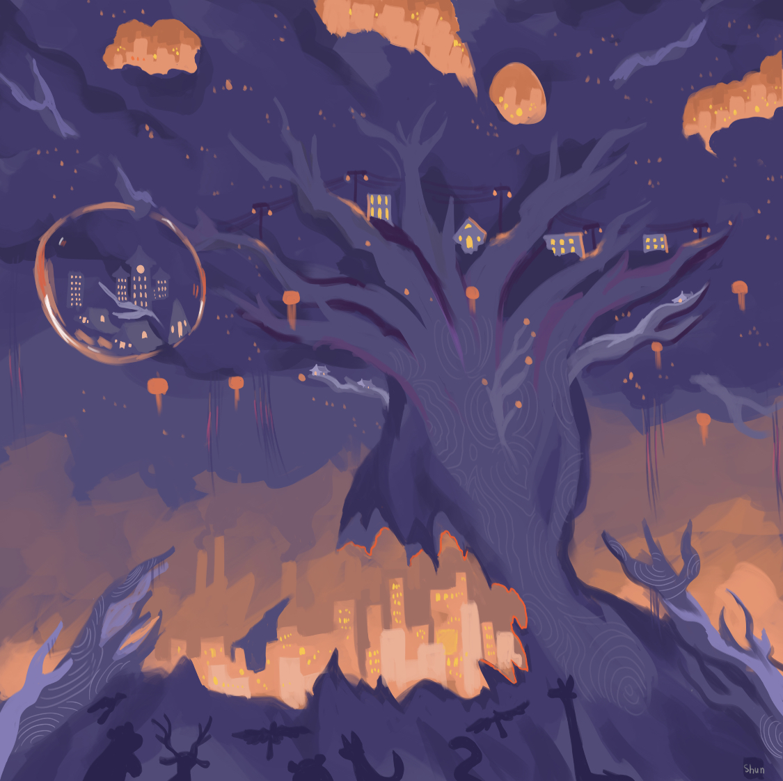 Trong thần thoại Bắc Âu, cả thế giới được phát triển trên một cái cây, mình lấy ý tưởng này làm chủ đề chính cho bức tranh của mình, kết hợp vào đó là sự sáng tạo của bản thân nhằm giúp cho người xem dễ hình dung hơn về tác động của ô nhiễm môi trường và đô thị hoá quá mức đến đời sống của con người và thiên nhiên. Phần tán cây đó là nơi sinh sống của con người, nhưng đó là sự bình yên của các bản làng thôn xóm, sự bình yên dần dần bị đe dọa khi dưới gốc cây xuất hiện các thành phố, nhà máy và những con người với tham vọng khai thác các tài nguyên ở gốc cây, họ càng khoét vào sâu trong gốc cây để mở rộng thành phố của mình. Nhưng dưới gốc cây vốn dĩ là nơi sinh sôi và phát triển của các loài động vật, từ khi đó mà động vật bị mất đi chỗ ở, đành phải lang thang nhìn quê hương của mình dần biến mất. Bức tranh như lời cảnh tỉnh cho sự phát triển và khai phá thiên nhiên quá mức của con người.