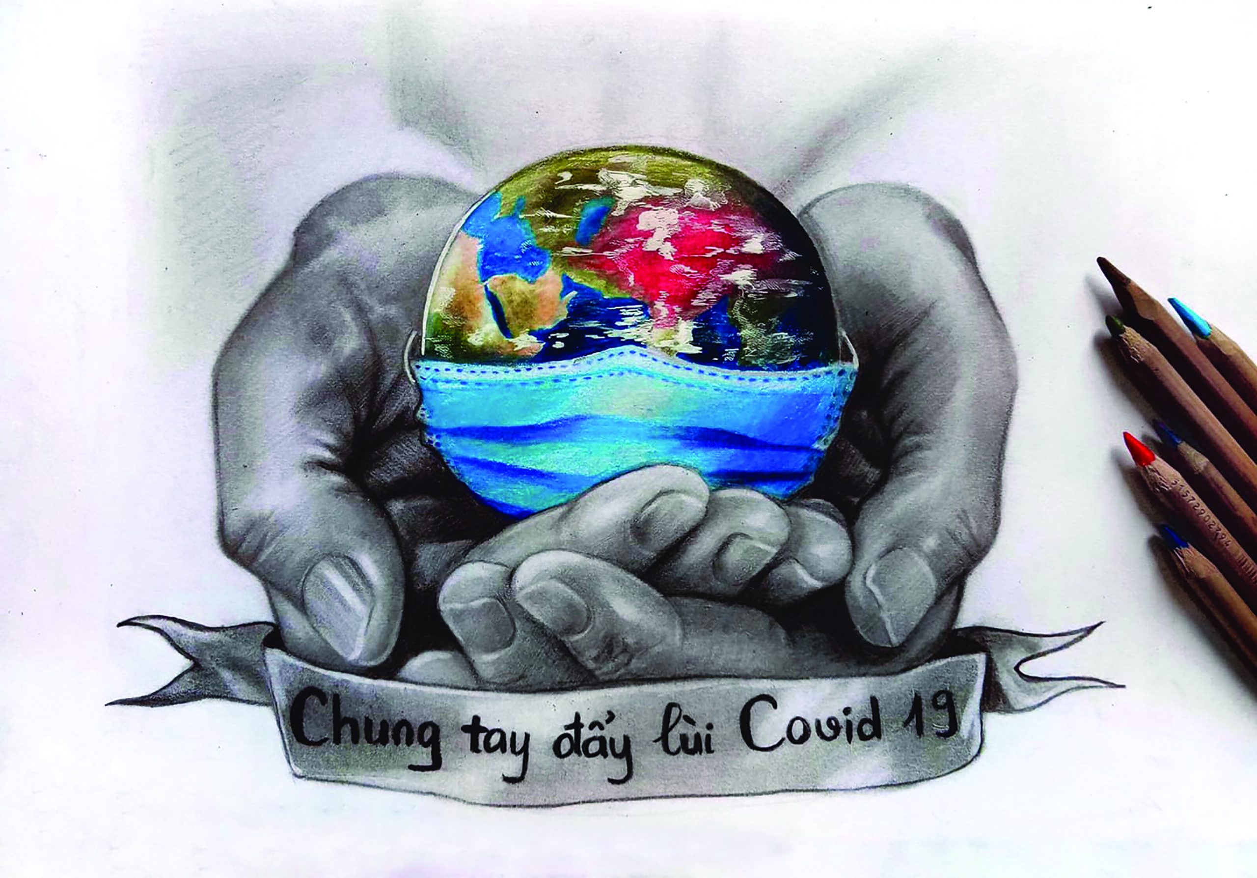 Đây là tác phẩm được mình vẽ và hoàn thành để ủng hộ tinh thần chống dịch Covid 19 của cả nước. Tình hình dịch bệnh đang diễn ra khá căng thẳng và phức tạp, nhà nước ta và toàn dân đang cố gắng hết sức đẩy lùi dịch bệnh để mọi người có thể quay trở lại cuộc sống thường ngày. Có thể thấy Trái Đất của chúng ta đang bị “bệnh” và phải chịu rất nhiều tổn thương do ô nhiễm môi trường, hơn hết là ngay lúc này là do sự bùng phát của dịch bệnh và con người đang phải gánh chịu những hậu quả đó. Vì vậy mỗi người hãy chung tay cùng cả nước đẩy lùi dịch bệnh và bảo vệ Trái Đất thân yêu của chúng ta.