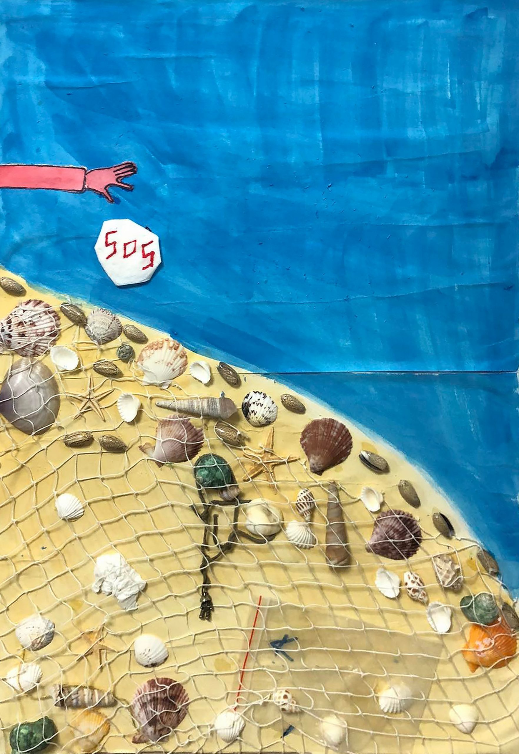 Đại dương xanh là một món quà quý giá của thiên nhiên ban tặng. Thế nhưng sinh vật biển lại đang bị đe dọa nghiêm trọng bởi các hoạt động đánh bắt lưới, xả rác bừa bãi của con người. Bức tranh đa chất liệu miêu tả lại thực trạng nhiều loài vẫn đang mắc kẹt trong bãi rác thải con người tạo ra dưới đáy đại dương khiến môi trường sống của chúng ô nhiễm. Vậy nên hãy bảo vệ môi trường biển cũng như bảo vệ chính trái đất nơi ta đang được sống.