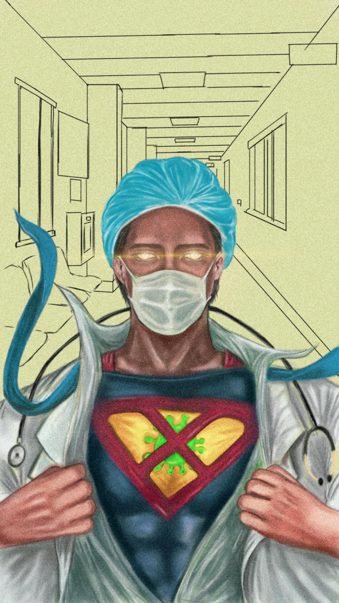 Siêu Nhân là một nhân vật siêu anh hùng hư cấu trong loạt truyện tranh cùng tên nổi tiếng của Mỹ do hãng DC Comics phát hành. Từ hình ảnh người đàn ông thép bảo vệ trái đất em đã liên tưởng tới những người bác sĩ âm thầm bảo vệ sức khỏe của cộng đồng. Trong thời kỳ dịch bệnh đang diễn biến phức tạp hiện nay thì các y bác sĩ được ví như Superman đời thực. Dựa trên hình ảnh người hùng cởi áo để chuẩn bị chiến đấu thì em đã sáng tạo thành người bác sĩ chống dịch bảo vệ người dân để lộ bên trong là bộ đồ Superman. Em không vẽ mặt của nhân vật chính theo mặt của ai bởi vì đây là đại diện cho tất cả những người hùng có tinh thần chống dịch bệnh, những con người có tư tưởng sống cao đẹp, biết hy sinh vì người khác.
