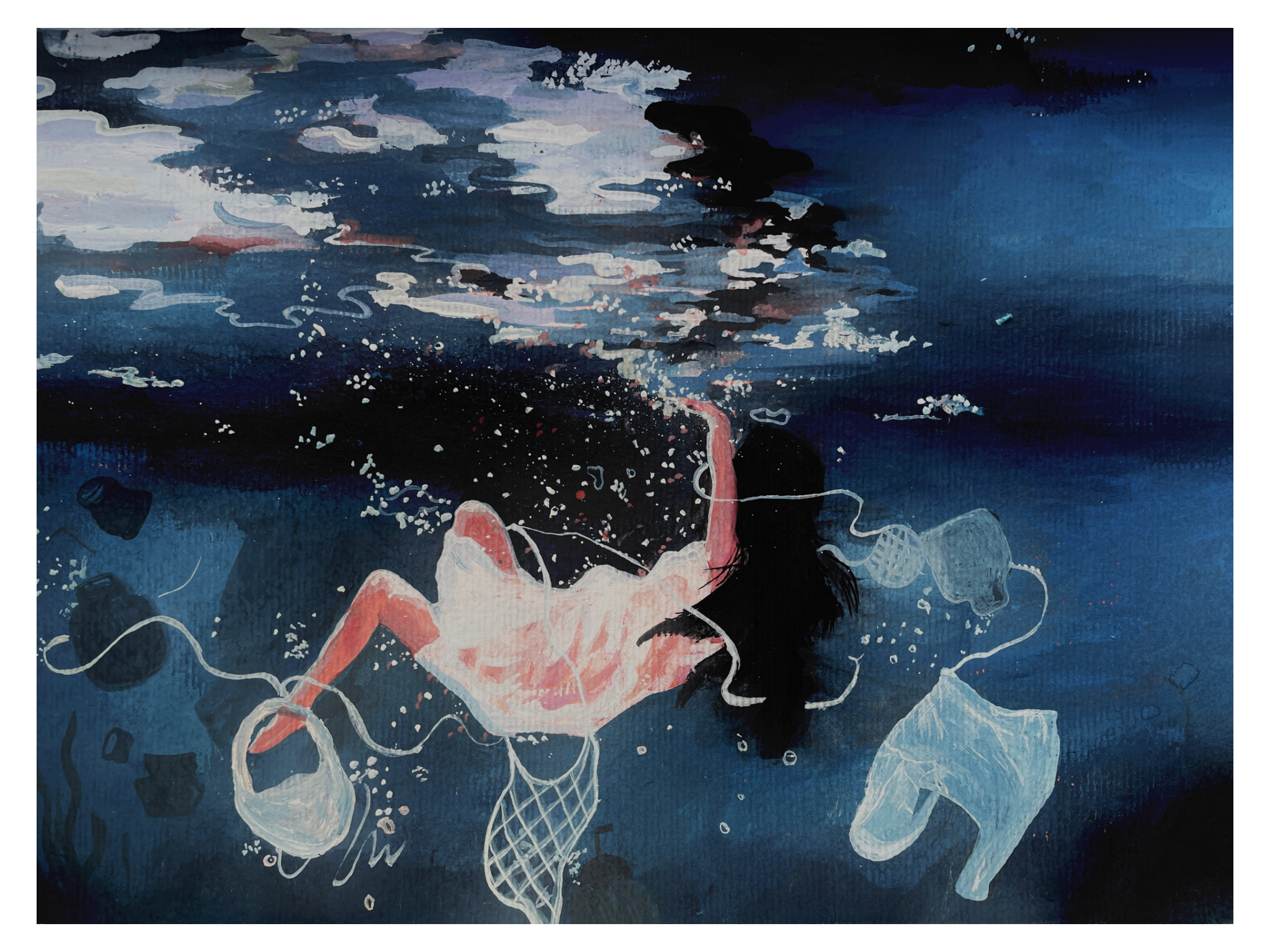 Dưới vẻ đẹp tĩnh lặng của biển cả, bóng tối của sự phá hủy bắt đầu lan tỏa. Những ngọn sóng dịch chuyển từ màu biển xanh sang màu đen của biển rác, như lời cảnh báo về một hiểm họa đang tiến gần. Chúng ta tỉnh giấc khi mọi thứ đã quá muộn. Biển cả từng đẹp đẽ, trong xanh nay biến thành một biển rác. Còn con người, kẻ ngụy biện trong bề ngoài hiện đại, tri thức đang dần bị vấy bẩn bởi tác động không ngừng từ những gì họ đã tạo ra. Họ như những người mù điểm đang lang thang trong mê cung rác thải, tìm kiếm sự giải thoát mà họ đã mất đi. Khi họ đứng giữa cuộc hủy diệt mà họ tạo ra, họ thấu hiểu rằng việc bảo vệ môi trường không chỉ là trách nhiệm của một số người, mà là nhiệm vụ của toàn bộ nhân loại. Chúng ta cần thức tỉnh và hành động ngay, để ngăn chặn sự tiếp tục của cuộc tàn phá và để lưu giữ lại vẻ đẹp của khung cảnh biển trước khi nó hoàn toàn biến mất khỏi tầm mắt. Hãy bảo vệ biển cả, bảo vệ môi trường, để tương lai chúng ta không chỉ là một bức tranh hư ảo, mà là một hiện thực đẹp để và bền vững.