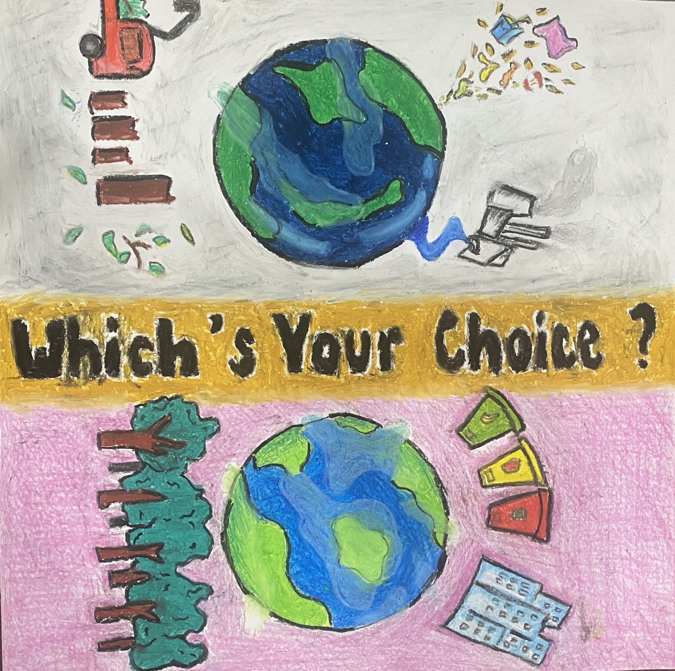 Đây là một bức tranh chia làm 2 viễn cảnh của Trái Đất. Trong thực trạng đáng báo động của thiên nhiên quanh ta, ý thức và hành động của con người là không thể thiếu. Khung cảnh bên trái thể hiện sự lụi tàn của Trái Đất bởi các tác nhân gây ô nhiễm như: rác thải sinh hoạt, nước bẩn, hoá chất và khói bụi do các nhà máy thải ra sông suối, nạn chặt phá rừng,… Mặt còn lại thể hiện sự xanh tốt và tươi tắn của thiên nhiên khi con người có ý thức giữ gìn vệ sinh, trồng cây gây rừng, phủ xanh đồi trọc,… Chính vì vậy, viễn cảnh sắp tới của Trái Đất giờ đây nằm trong tay nhân loại. Trái Đất liệu sẽ xanh tốt bởi màu của lá cây, bầu trời hay là chìm ngập trong một màu xám xịt của khói bụi, cái nóng từ hiệu ứng nhà kính, tất cả đều do chính sự quyết định của con người chúng ta. Cuối cùng thông qua bức tranh này, em muốn truyền tải một thông điệp: “Lựa chọn là của bạn, kết quả là của cộng đồng”.