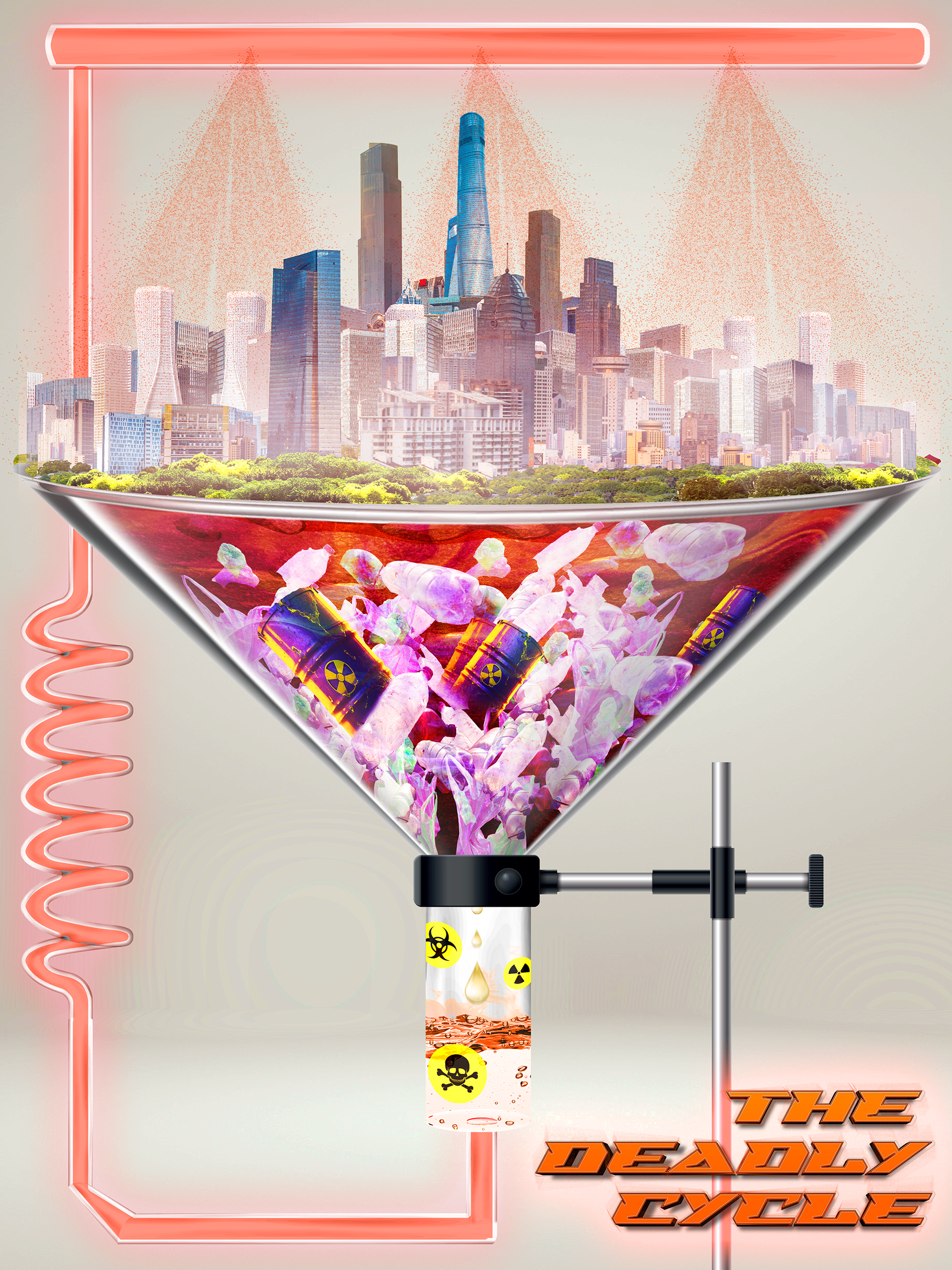 “The Deadly Cycle” nhấn mạnh sự vô tình và vòng luẩn quẩn độc hại mà con người đang tạo ra trong quá trình phát triển thế giới hiện đại. Tác phẩm minh họa một thành phố phồn thị đang phát triển bình thường ở trên mặt đất. Nhưng điều đặc biệt nằm ở phần dưới, nơi mà lòng đất đã ngập tràn bởi rác thải và chất phóng xạ. Tất cả những chất độc hại này cuối cùng theo một chu trình quay trở lại thành phố và tàn phá thành quả mà họ xây dựng. Thông điệp chính là con người đang tạo ra một chu trình tự hủy hoại. Họ có thể xây dựng một thế giới văn minh hiện đại, nhưng việc không ý thức trong việc quản lý rác thải và chất độc đã biến thành phố thành một nguồn nguy cơ rất lớn đối với sức khỏe và môi trường của họ. Tác phẩm này gợi ý sự cần thiết của sự thay đổi và tập trung vào giáo dục để ngăn chặn vòng luẩn quẩn độc hại này.