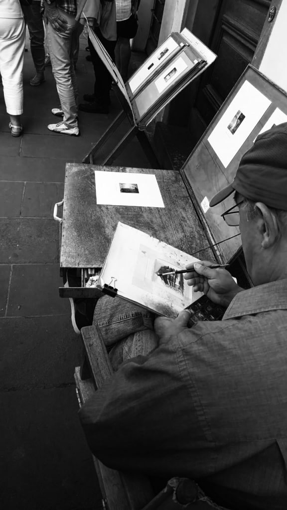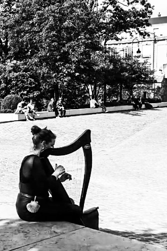 Một người phụ nữ đang chơi đàn hạc.Một nhà thờ cổ xưa của Pháp.Người nghệ sĩ đường phố.Tàu điện ngầm ở Paris.