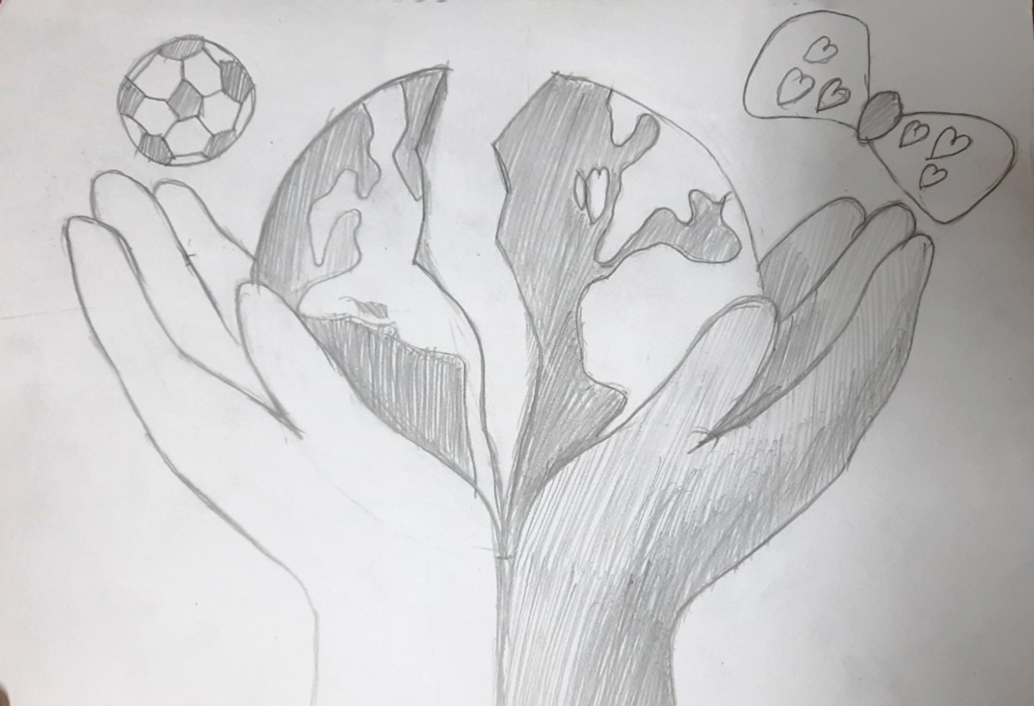 Trái đất hiện nay đang gặp nhiều vấn đề liên quan đến môi trường và nhiều khía cạnh khác khiến Trái đất đang giận dữ, đau đớn đến mức như muốn vỡ ra. Hai bàn tay màu đen và trắng thể hiện cho các màu da, quả bóng và cái nơ thể hiện cho mọi giới tính. Cùng nhau tất cả nâng niu và chữa lành ngôi nhà, gia đình, cộng đồng, xã hội, … TRÁI ĐẤT!