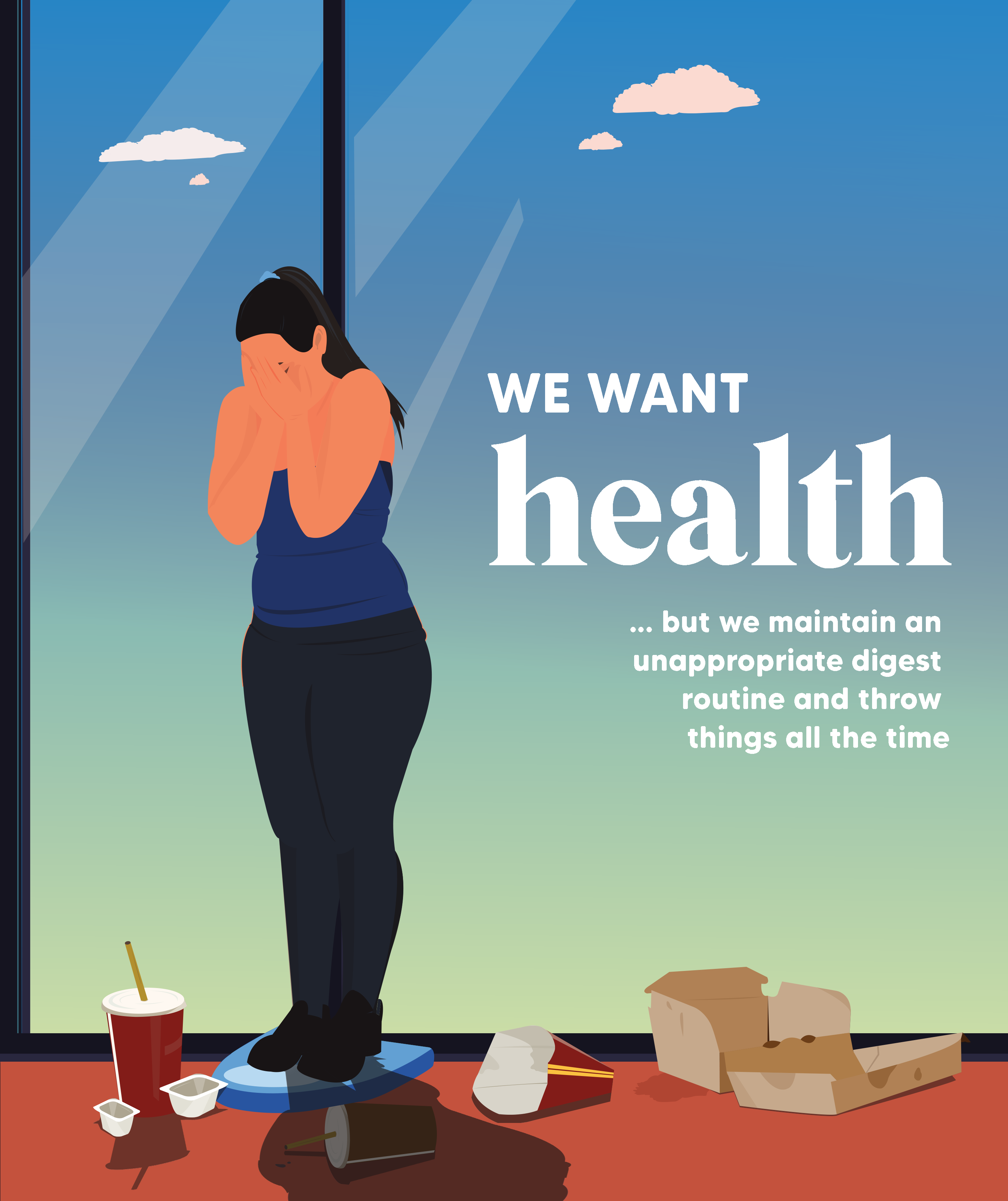 5. We want health but we maintain an unappropriate digest routine and throw things all the time: Khỏe mạnh bằng chế độ ăn uống điều độ, nhưng vẫn còn những người giữ thói quen thường xuyên tiêu thụ đồ ăn nhanh- dầu mỡ, cùng với đó là tật xấu xả rác bừa bãi gây ô nhiễm môi trường.