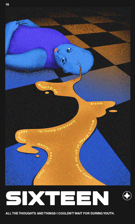 Hai tấm poster dưới đây đều thể hiện cảm xúc của mình khi đã chạm mốc 16. Tấm poster đầu thì cô gái đang nằm đấy với dòng chảy suy nghĩ về nhiều thứ(ngoại hình, ước mơ, v.v). Bước sang tuổi 16 cái tuổi mà mình bắt đầu để ý đến mọi thứ xung quanh và suy nghĩ nhiều hơn. Những dòng chữ chạy quanh co là những mối lo lắng của mình, đôi khi nghĩ nhiều thật mệt và, nói một cách phóng đại, muốn mẻ đầu. Tấm poster đầu mình muốn mang cảm giác tĩnh lặng chút (những lúc lắng lại để ta suy tư) nên đã không cho gam màu đỏ nổi trội vào.
