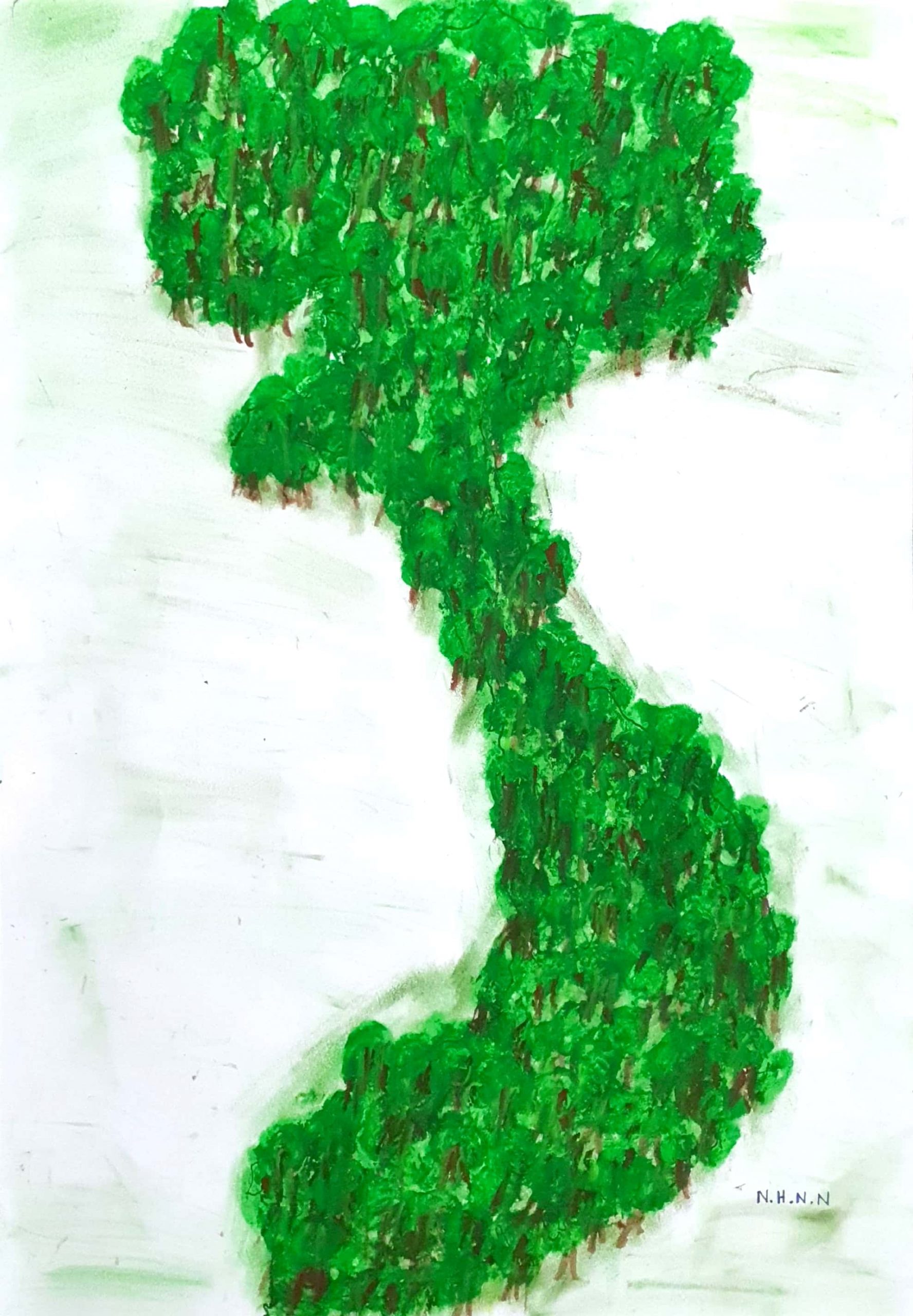 Em lấy cảm hứng từ một video clip của kênh Great Big Story về người phụ nữ màu xanh lá – bà Elizabeth. Cuộc sống của bà tràn ngập gam màu xanh từ mái tóc, đôi mắt cho đến những vật dụng xung quanh. Điều này thật sự gây ấn tượng đối với em và phần nào truyền cho bản thân em sự tích cực, mới mẻ và cảm thấy gần gũi với thiên nhiên. Nên thông qua bức tranh em vẽ là hình ảnh đất nước Việt Nam trong tương lai sẽ phủ đầy màu xanh của thiên nhiên, của đất trời. Chúng ta sẽ không còn sử dụng túi ni lông, sẽ luôn luôn có ý thức giữ gìn và bảo vệ môi trường, sẽ không phải đối mặt với dịch bệnh nguy hiểm và hơn hết sẽ hình thành cho riêng mình một lối sống xanh và khỏe mạnh.
