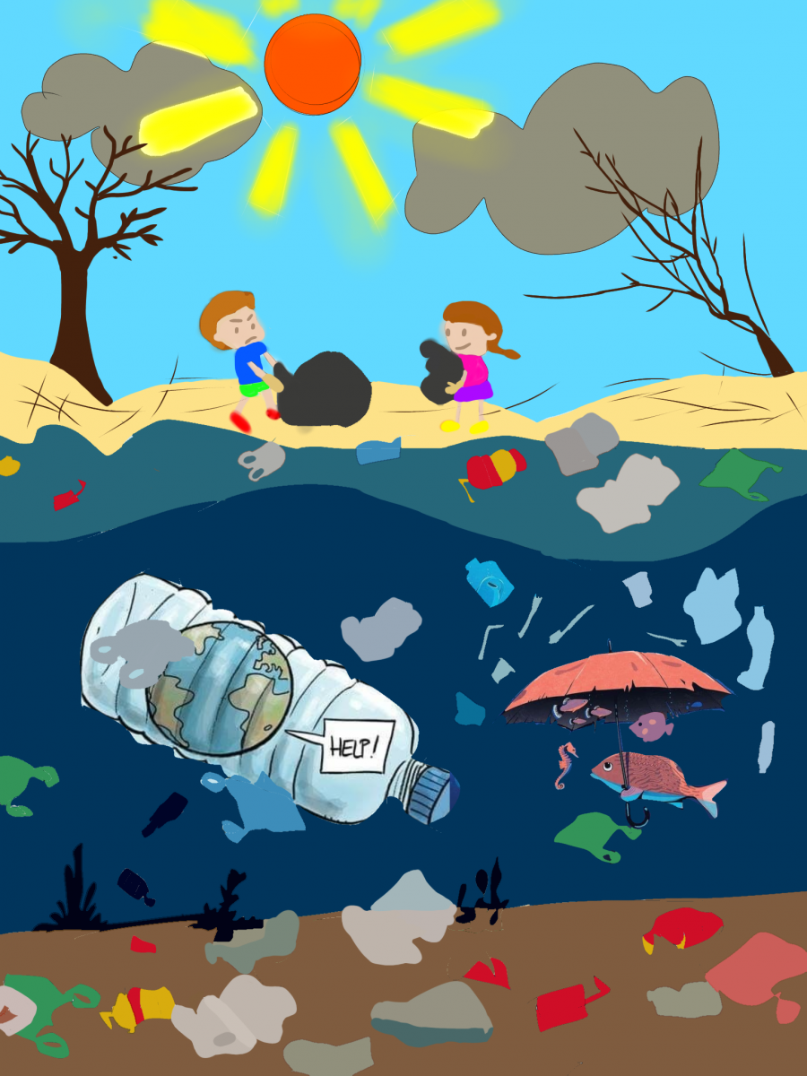Nước là nguồn sống cho con người. Thế nhưng, chính con người đã có những tác động làm hủy hoại sự trong sạch của môi trường nước. Tình trạng ô nhiễm nước không chỉ xảy ra ở Việt Nam mà nó xảy ra ở mọi quốc gia trên thế giới, như Anh, Pháp, Mỹ,… Một con số chấn động: thế giới hiện nay có hơn 1 tỷ người đang sống trọng tình trạng thiếu nước sạch trầm trọng. Thêm nữa, có sự chênh lệch đáng kể về việc phân bổ nước sạch tại quốc gia phát triển với quốc gia chậm phát triển. Việt Nam cũng là quốc gia đang đứng trước nguy cơ thiếu nước sạch. Ước tính mỗi năm, nước ta có khoản 9.000 người tử vong liên quan đến chất lượng nguồn nước, 200.000 người mắc ung thư do nguồn nước kém chất lượng. Tại Việt Nam, ô nhiễm từ bãi rác cũ khiến cuộc sống của người dân tại huyện Đông Hưng, Thái Bình bị ảnh hưởng rất lớn. Rác nổi trên bề mặt sông hồ, gây ảnh hưởng cảnh quan, ô nhiễm nguồn nước cũng như ảnh hưởng trực tiếp tới đời sống người dân xung quanh,… Chính những vấn đề này đã khiến hành tinh của chúng ta đã gần đạt tới “điểm cực hạn” của sự nguy hiểm. Và ngày mà Trái Đất chỉ còn là một hành tinh không sự sống như chúng ta thường thấy trên phim ảnh sẽ không còn xa trong tương lai, nếu hành động phá hủy môi trường vẫn còn tiếp tục. Bài vẽ trên của em là tiếng gọi CẦU CỨU của trái đất, của tất cả những sinh vật, thực vật có trên “Hành Tinh Xanh” này. Vì một tương lai trái đất XANH- SẠCH- ĐẸP, vì cuộc sống tốt đẹp của TOÀN nhân loại ta, hãy chung tay bảo vệ , giữ gìn môi trường, NGỪNG những hành động xấu ảnh hưởng đến môi trường vì SỰ SỐNG của chúng ta. Không cần phải làm những việc lớn lao gì, mỗi ngày mỗi người chỉ cần hạn chế, không sử dụng, không xả rác, gây nguy hại đến môi trường đã là một điều cao cả rồi. Hãy chung tay bảo vệ môi trường này hãy nói “SAY NO to PLASTIC”, “NO NATURE NO FUTURE”.
